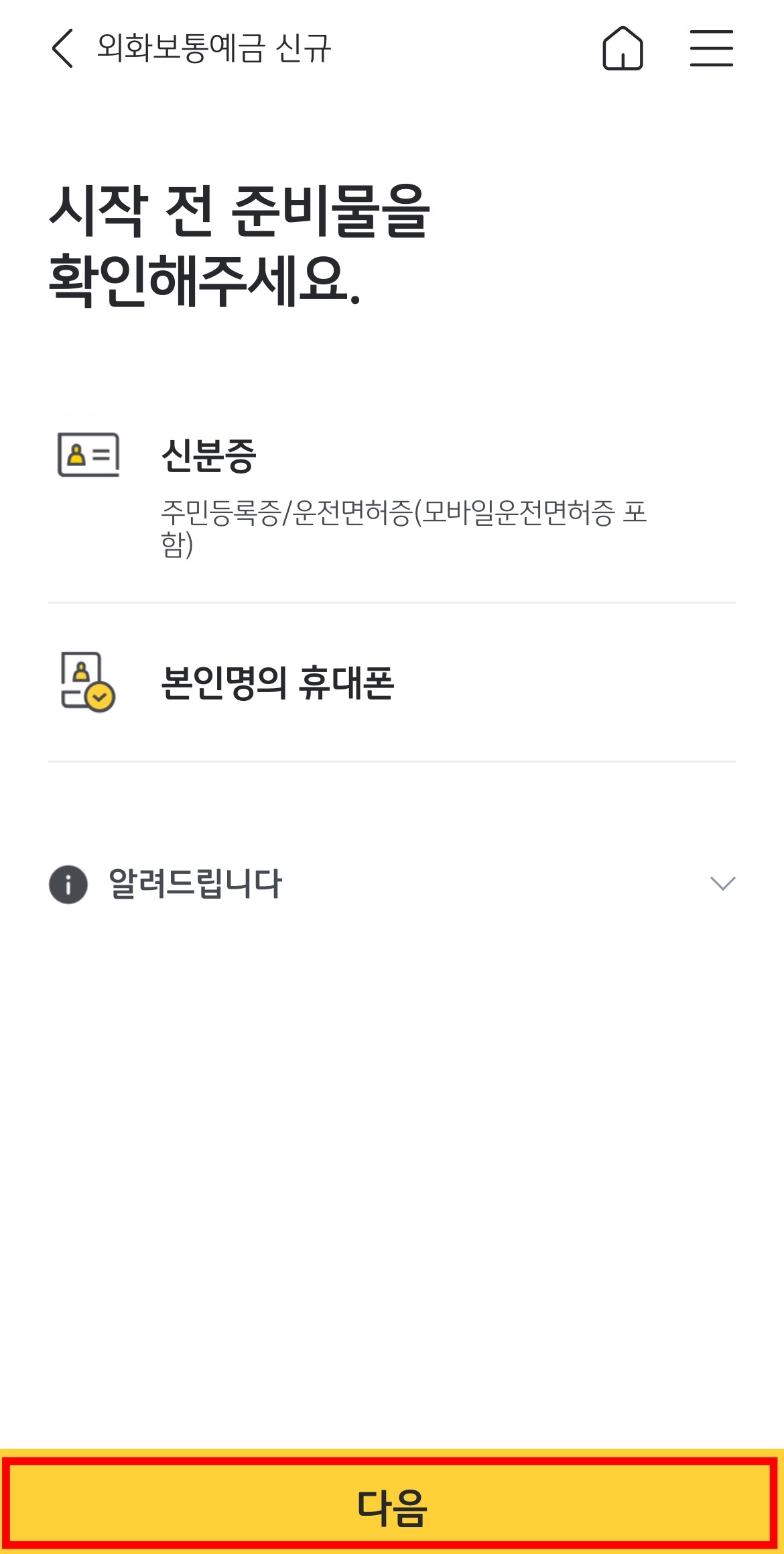 앞에서 말씀드린 사전 준비물을 확인해달라는 안내가 나옵니다.
