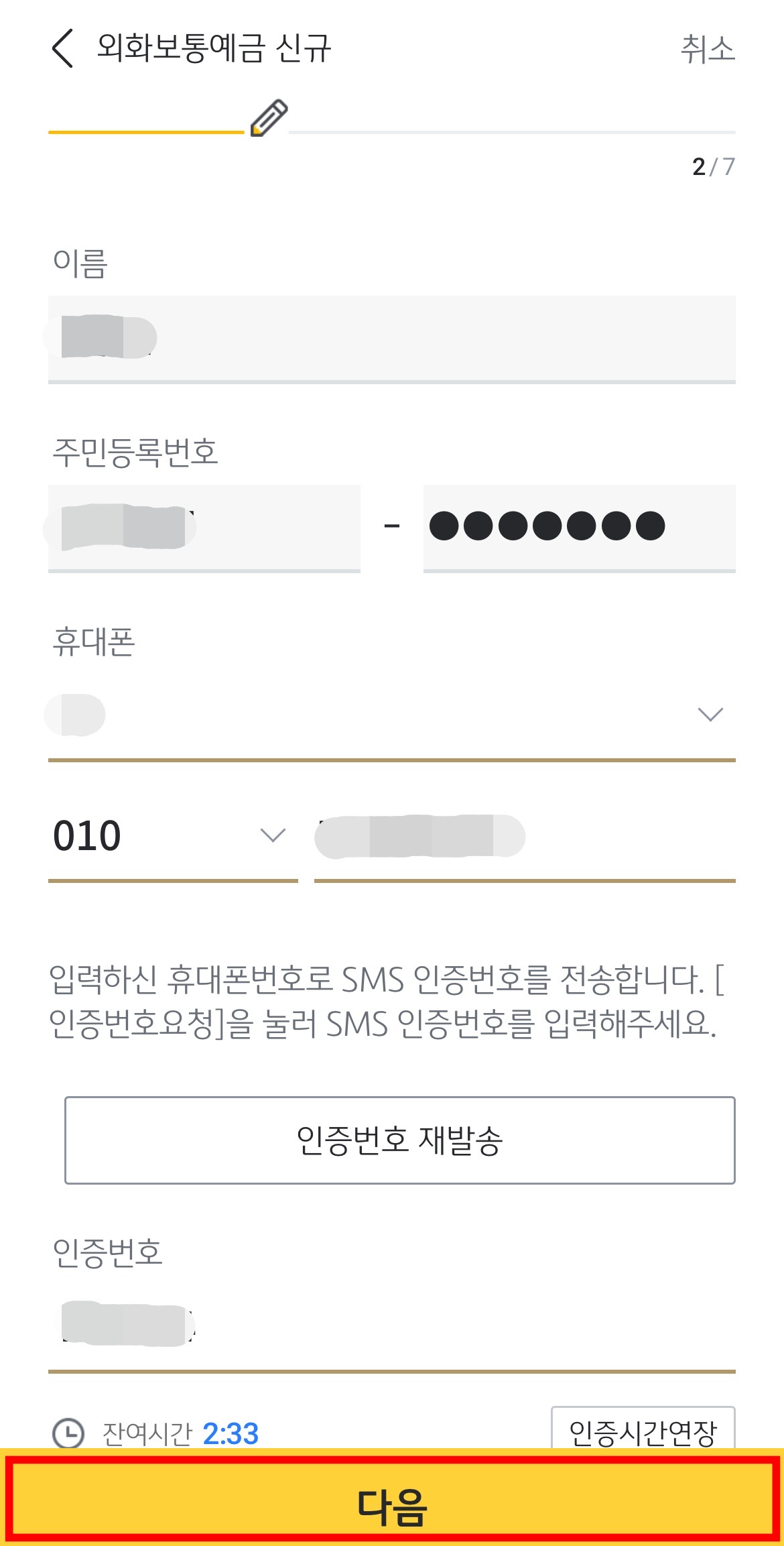 이제 '인증번호 발송'을 누르고 인증번호 문자가 오면 인증번호를 입력한 뒤 '다음'을 눌러 봅니다.