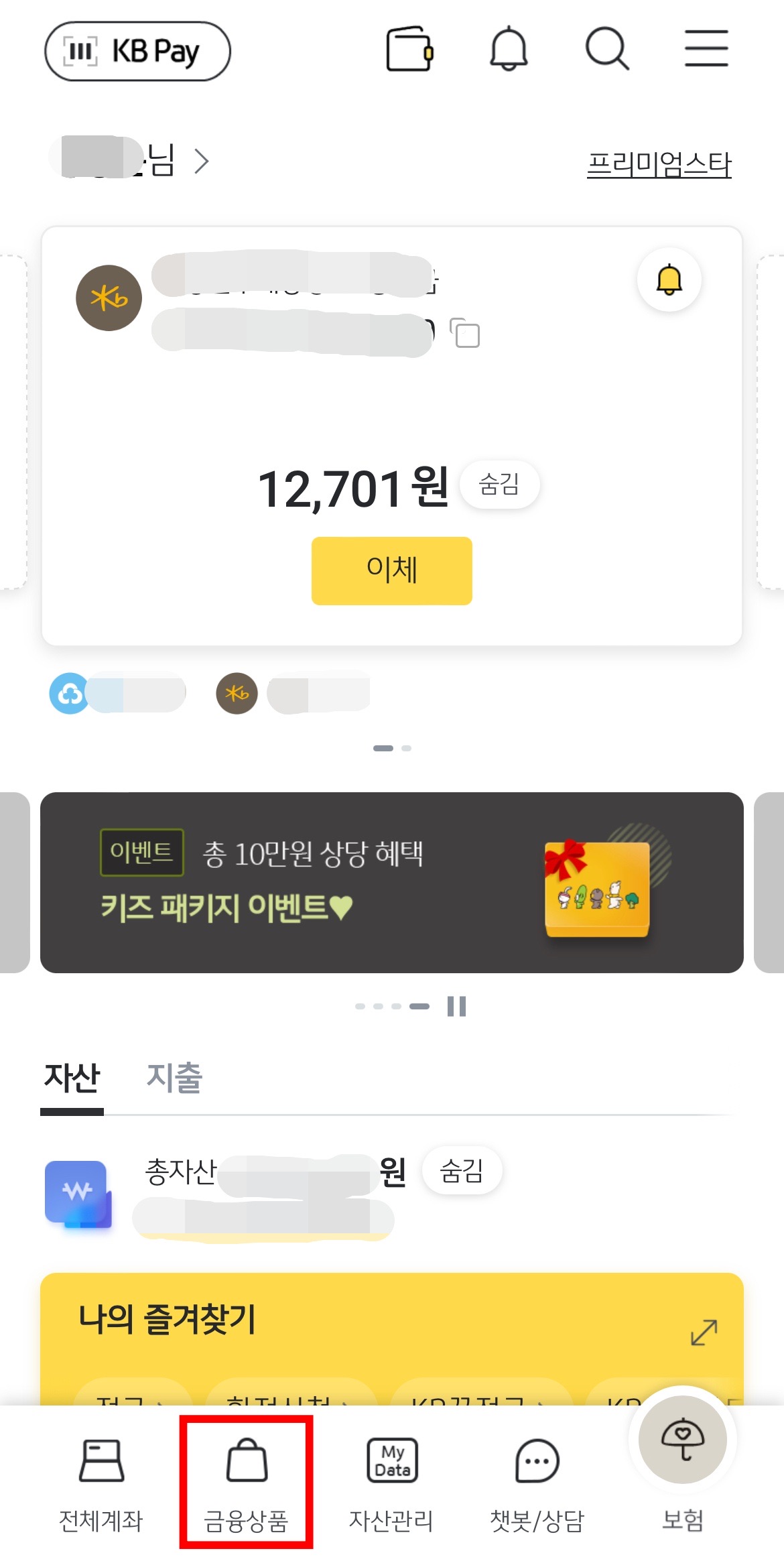 KB스타뱅킹 앱을 실행하면 아래와 같이 화면 제일 아래에 보이는 '금융상품' 메뉴를 눌러봅니다.