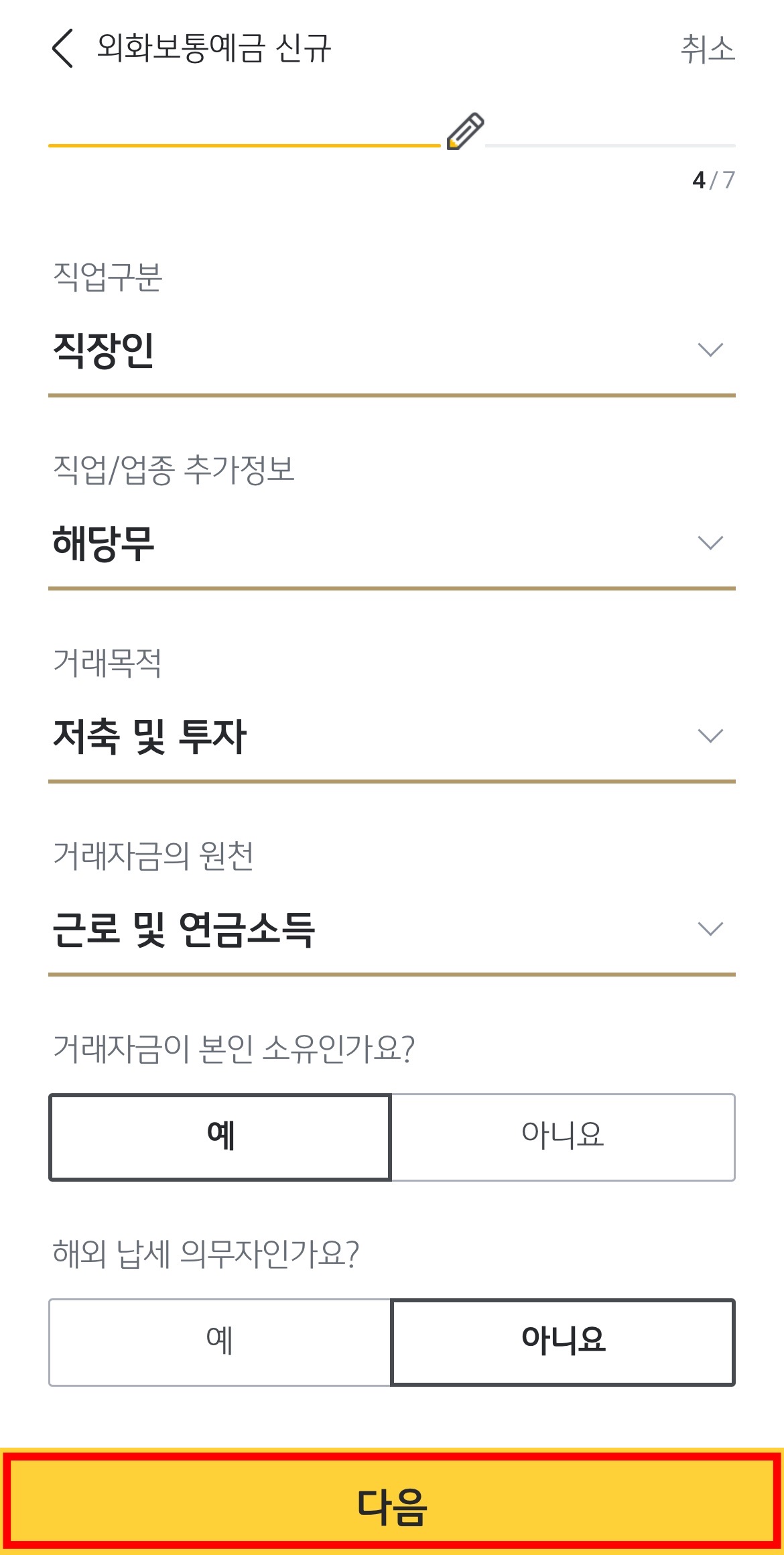 다음으로 직업 / 거래목적 / 거래자금의 원천 / 거래자금 본인 소유여부 / 해외 납세 의무자 여부에 대해 여러분이 해당되는 내용을 입력합니다.