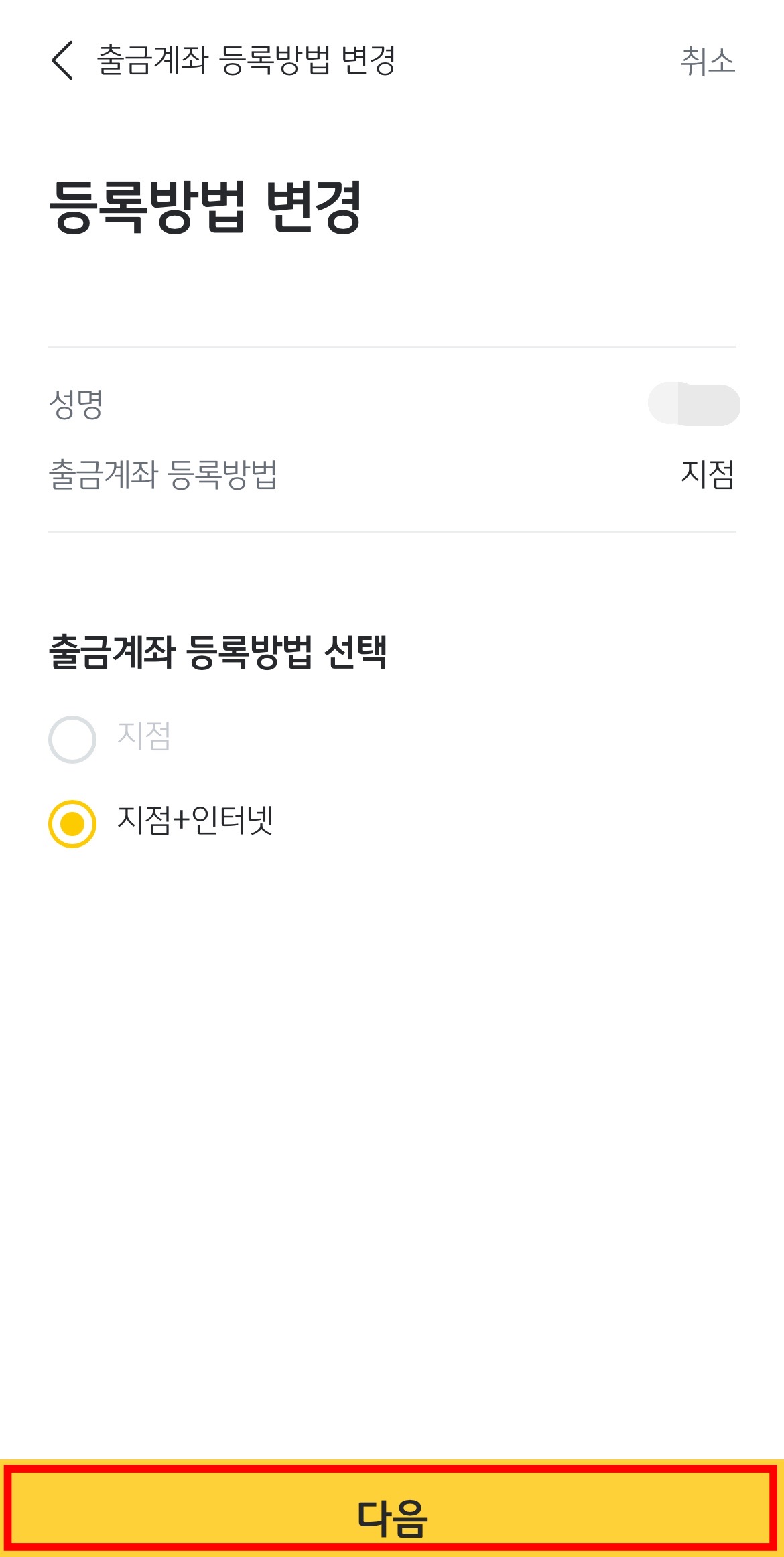 출금계좌 등록방법 선택에서 '지점+인터넷'을 선택하시고 '다음'을 눌러봅니다.