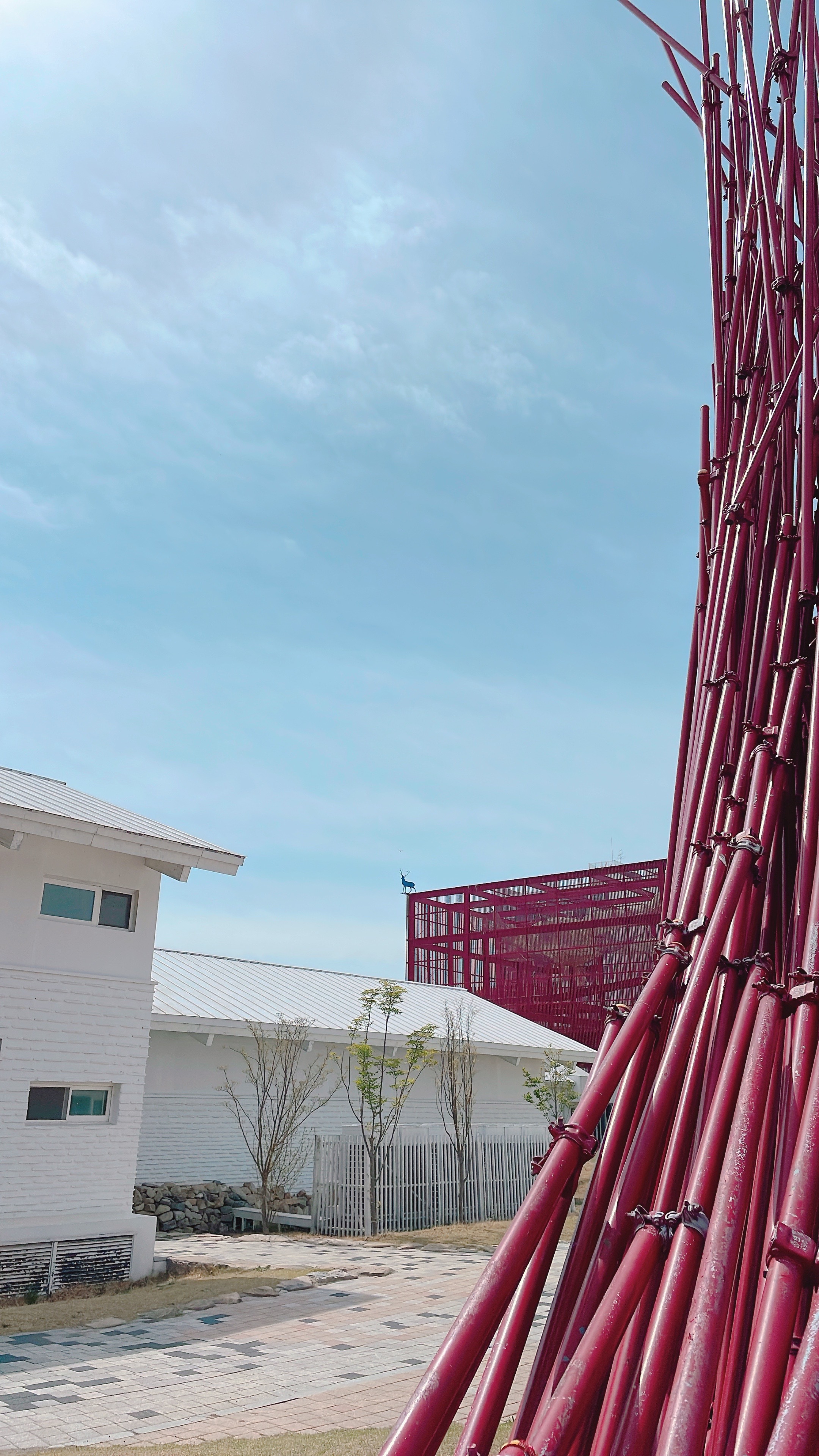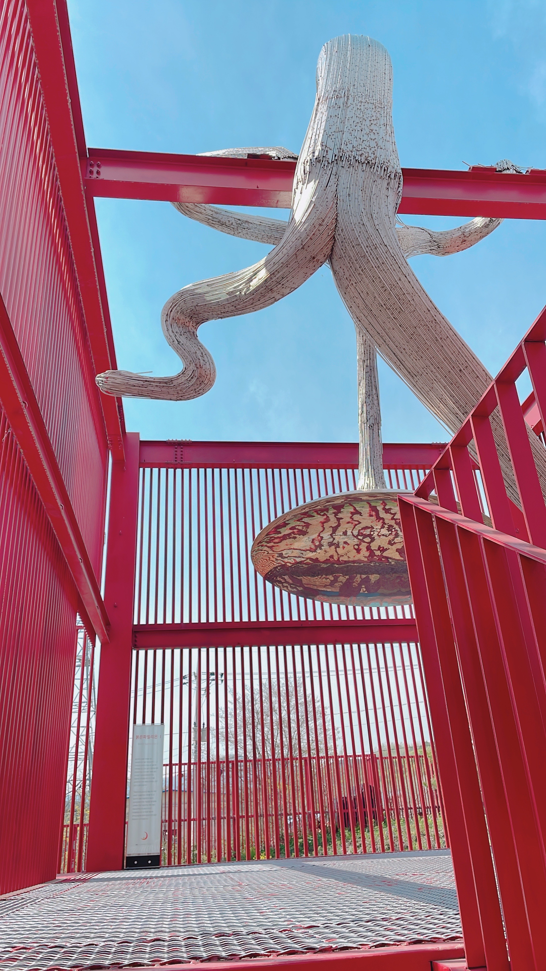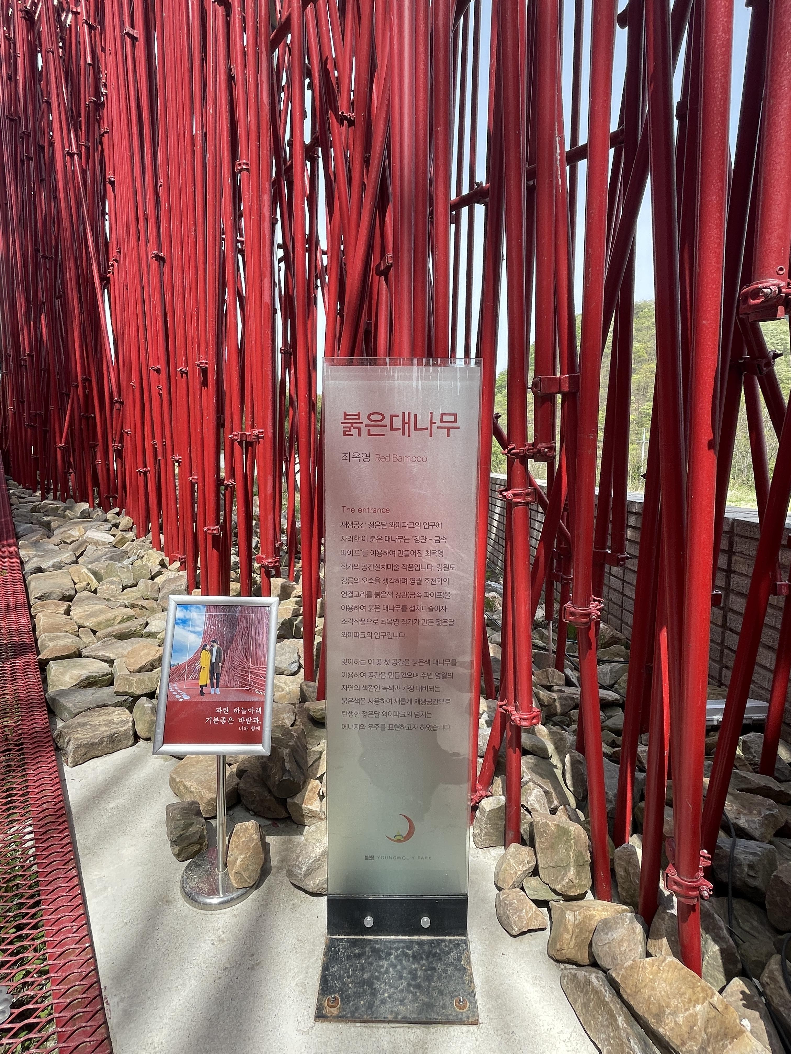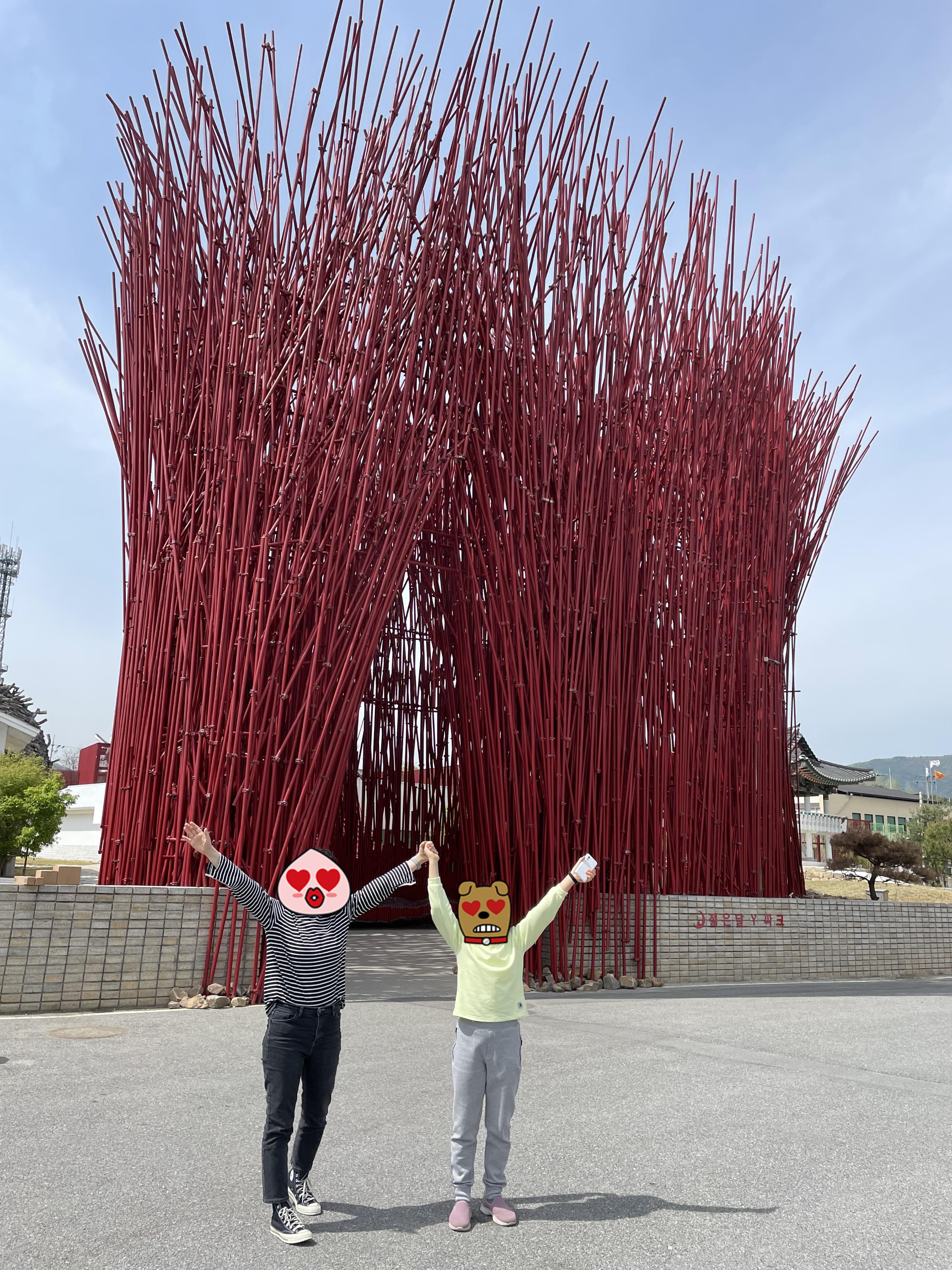 빨간색 길다란 조형물이 대나무처럼 길쭉한 나무인가 했는데 가까이 가서 보니 금속 재질입니다.