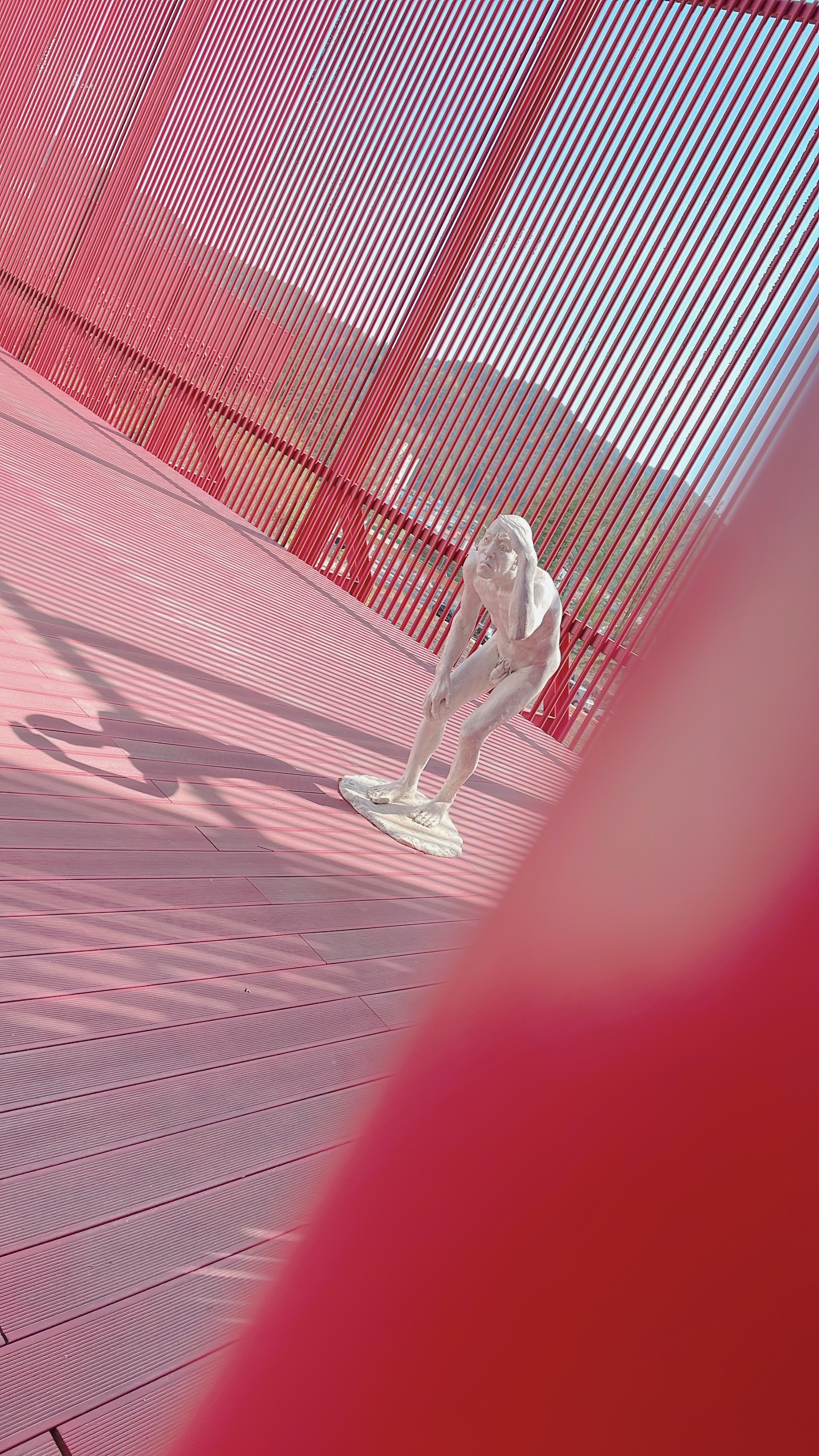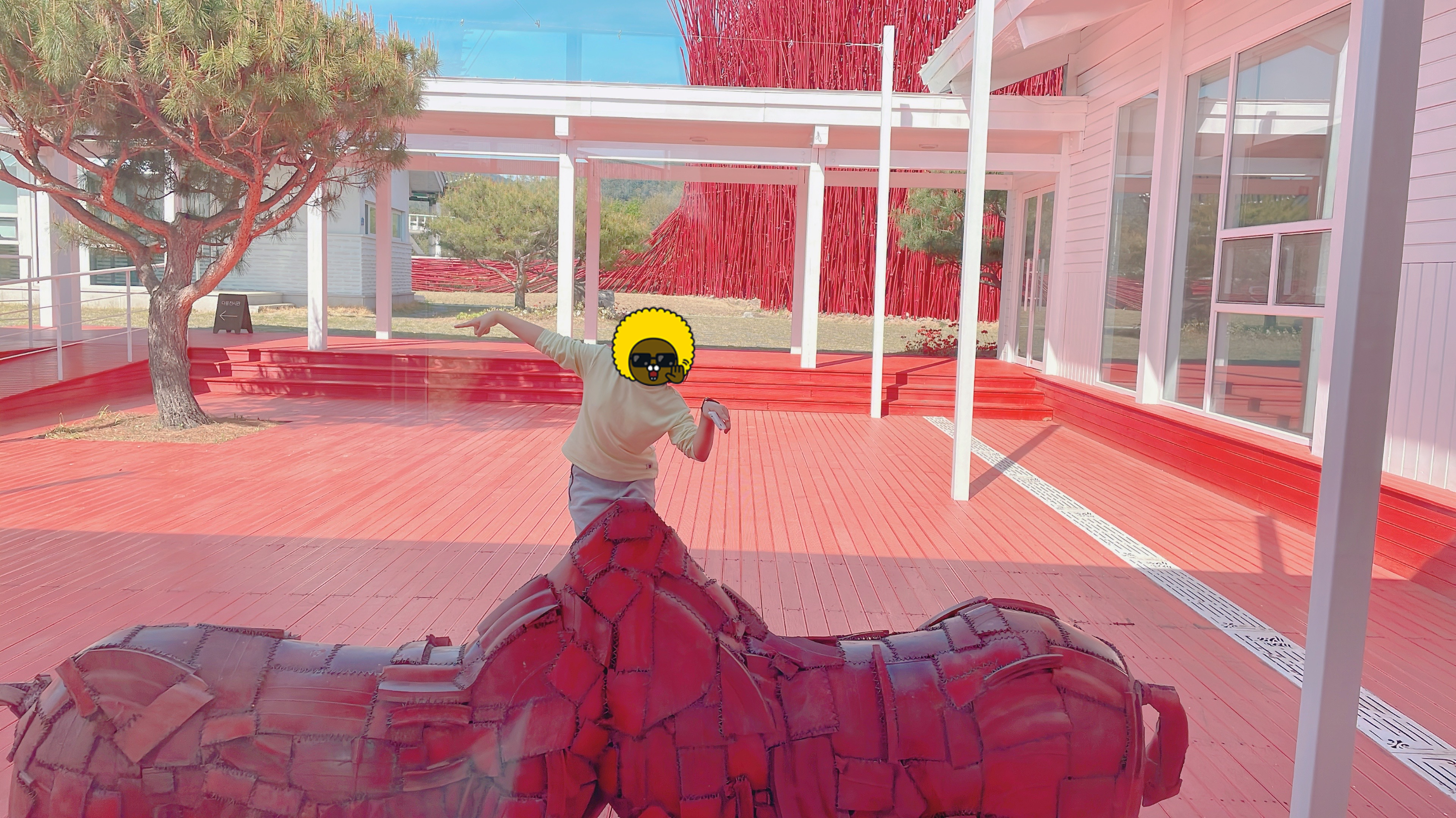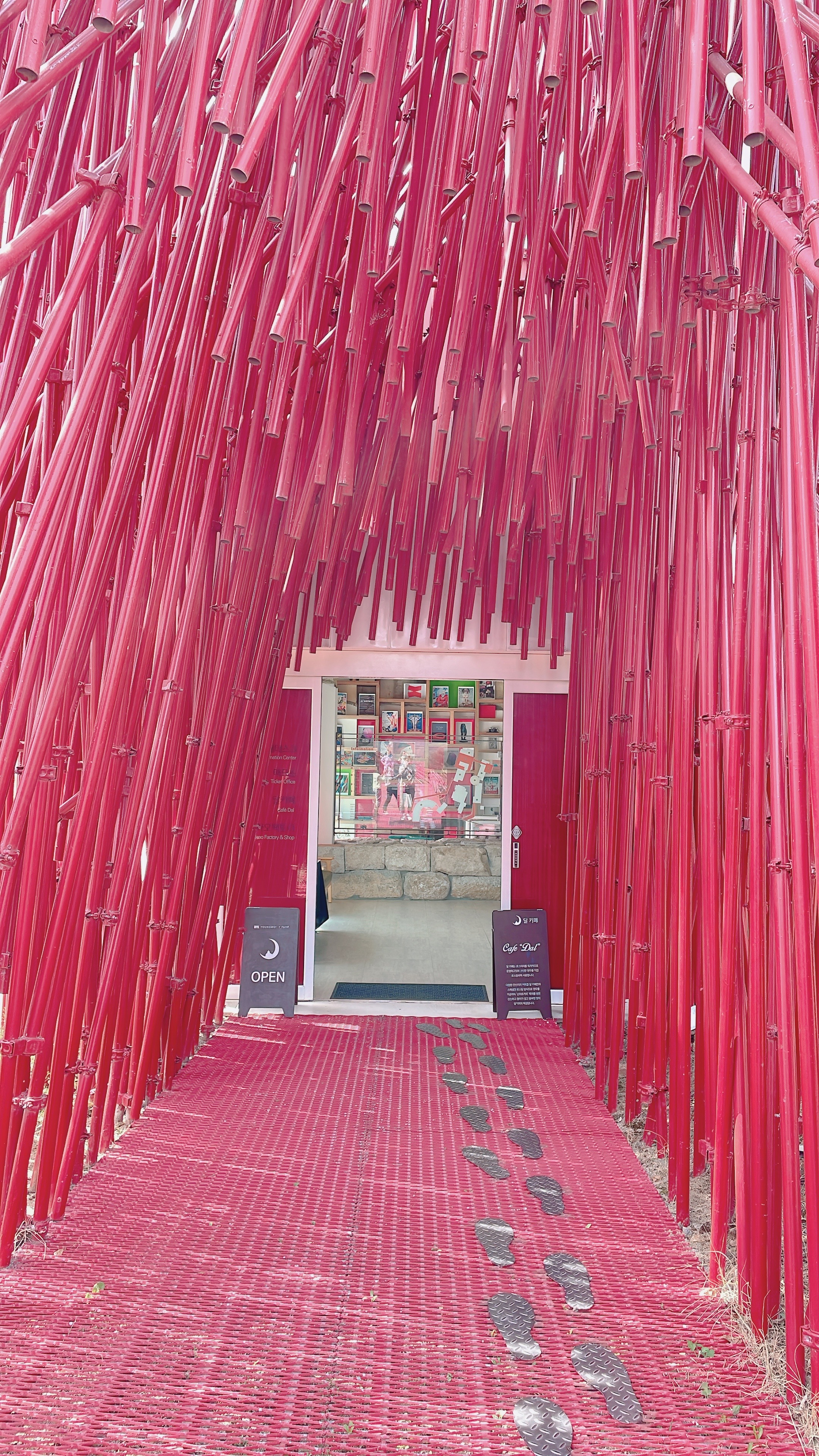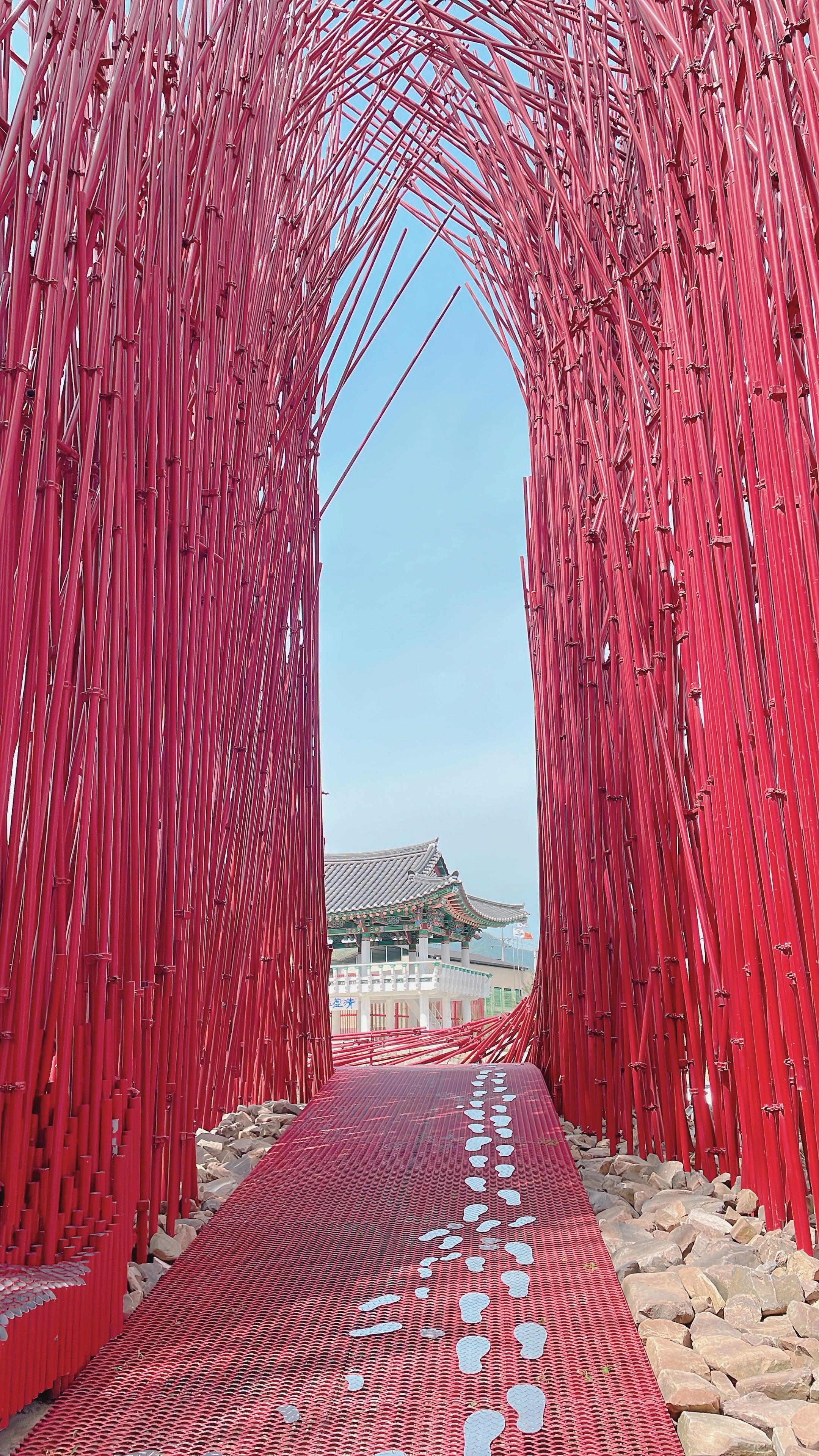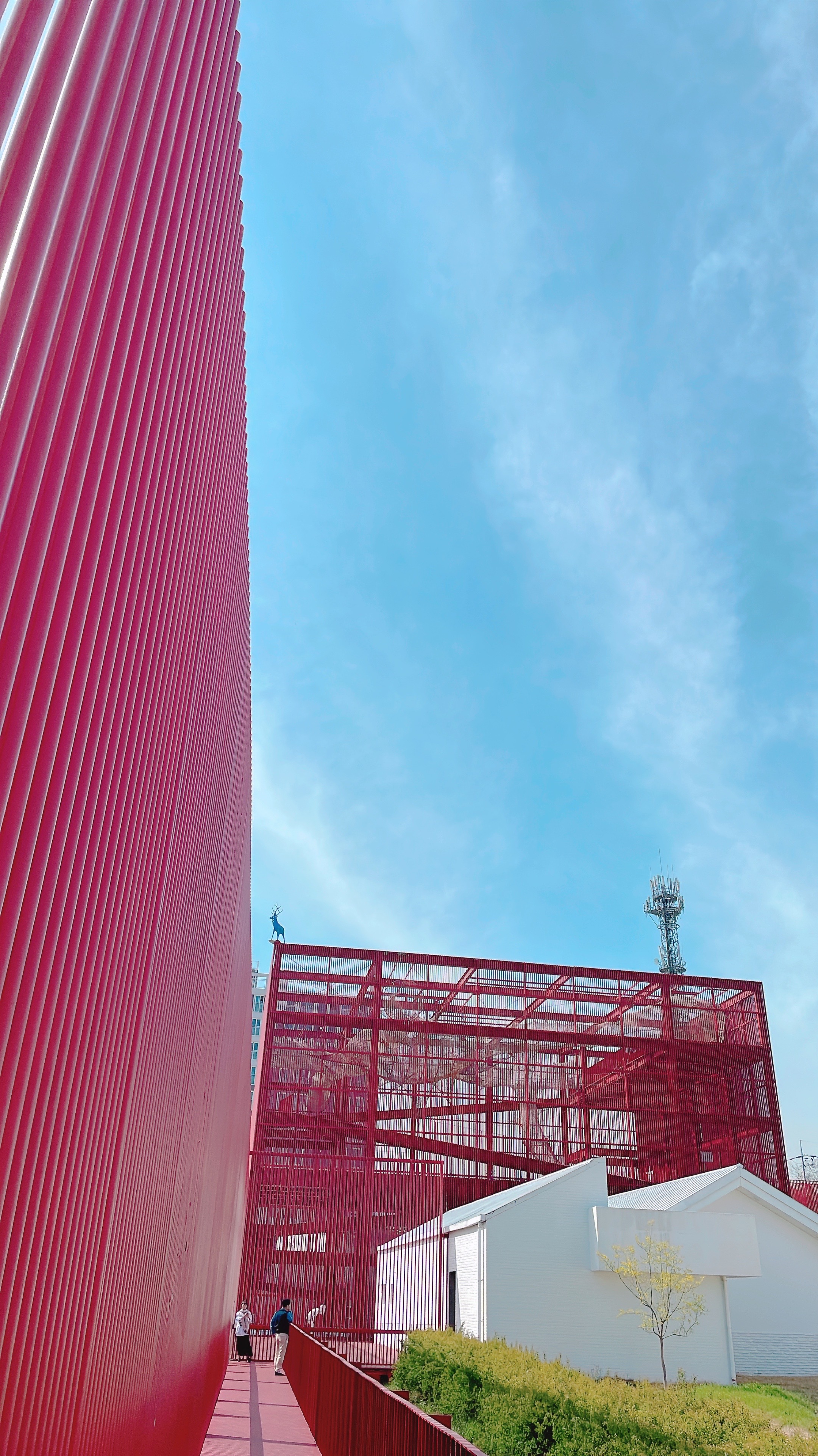 빨간색 길다란 조형물이 대나무처럼 길쭉한 나무인가 했는데 가까이 가서 보니 금속 재질입니다.