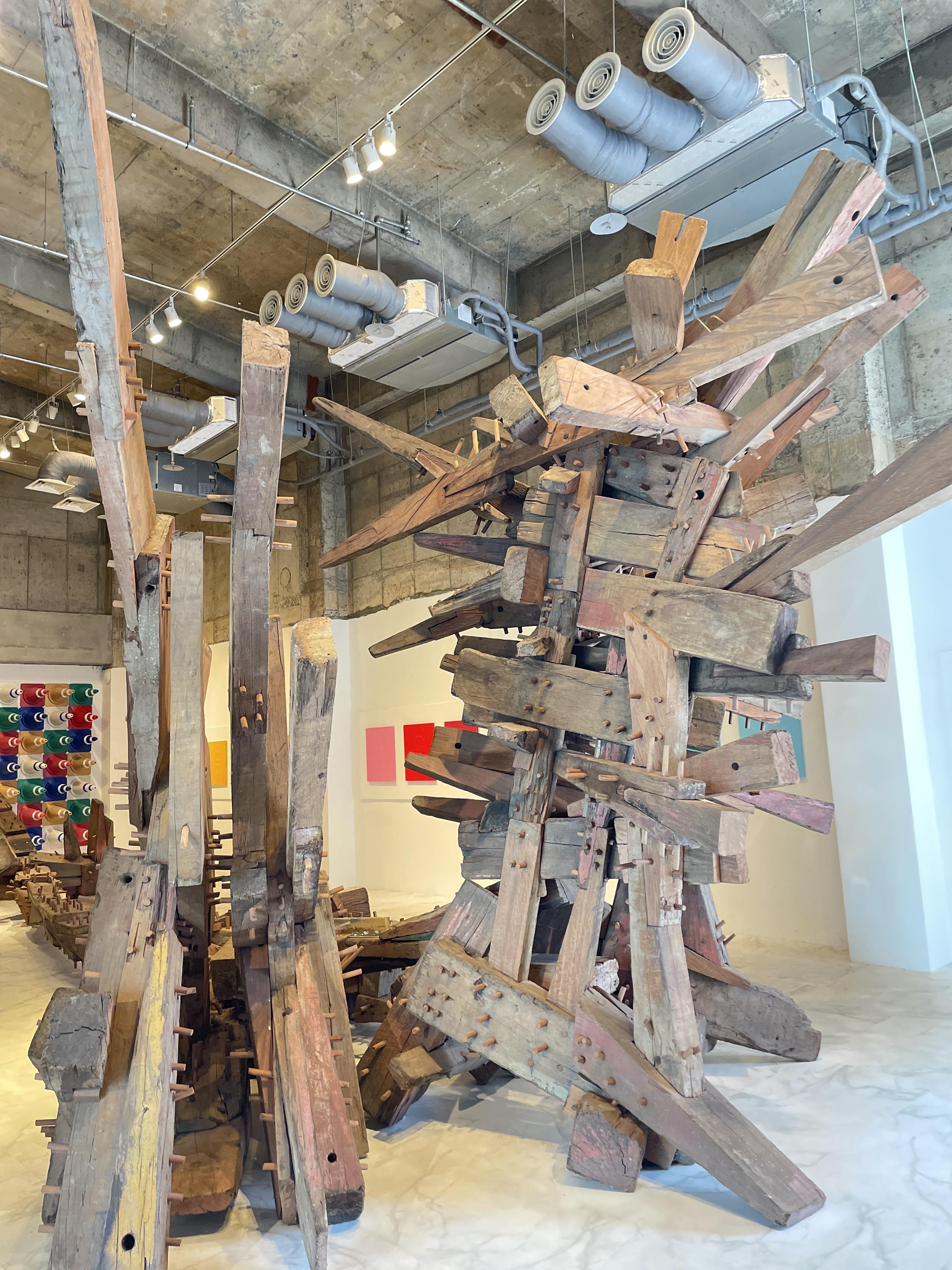 오른발을 들고 넘어지는 듯한 자세를 취한 나무 조형물입니다.