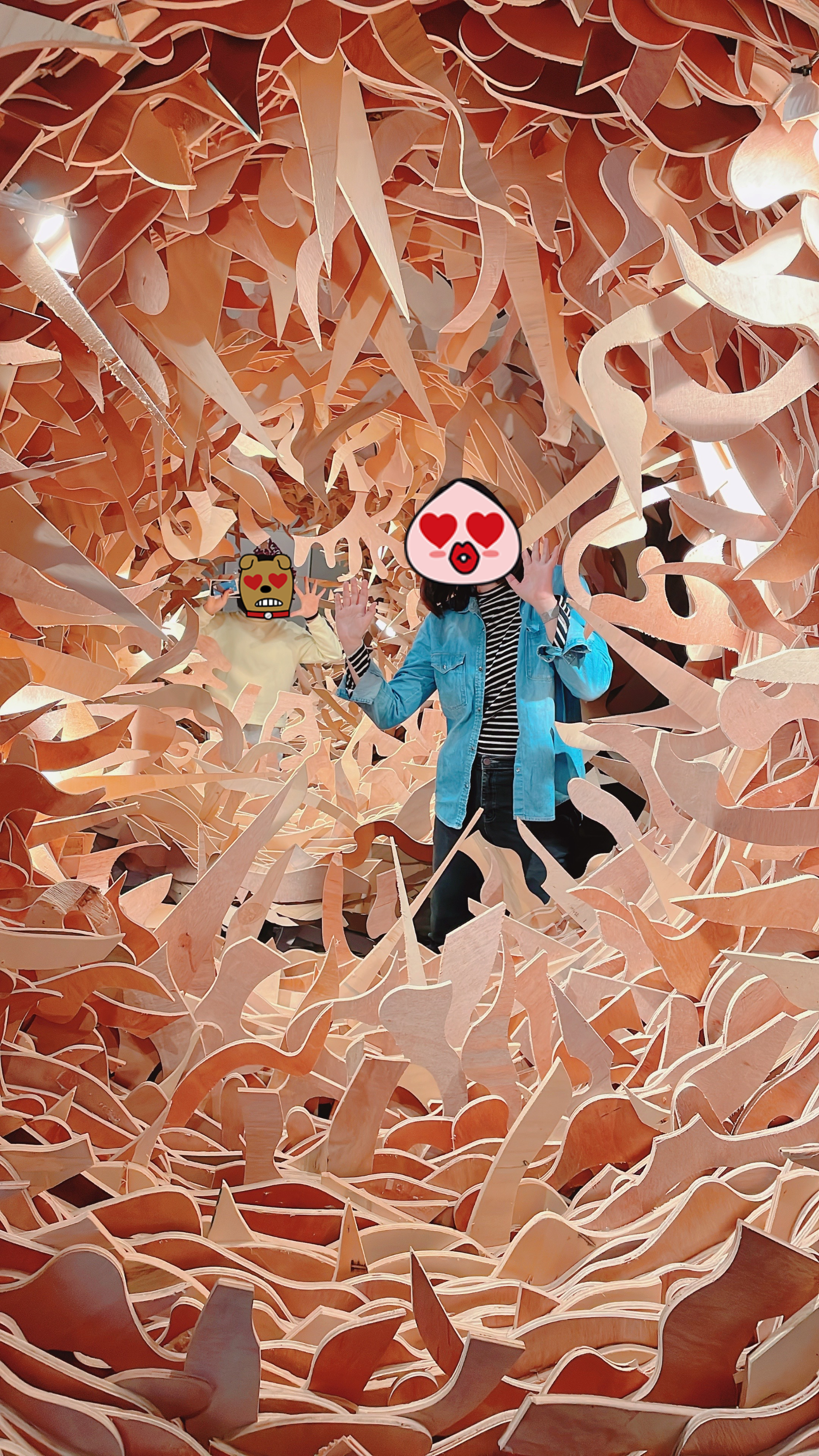 어두운 얼굴의 조형물 옆에서 두 사람이 긍정의 에너지를 전해줍니다~