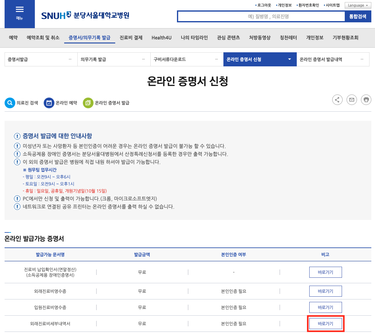 외래 진료 당일에 분당서울대학병원에서 진료비세부내역서를 출력해 올 수도 있지만 깜빡하시거나 다른 일정으로 바쁘신 경우에는 이번 포스팅을 참고하시면 도움이 되겠습니다.