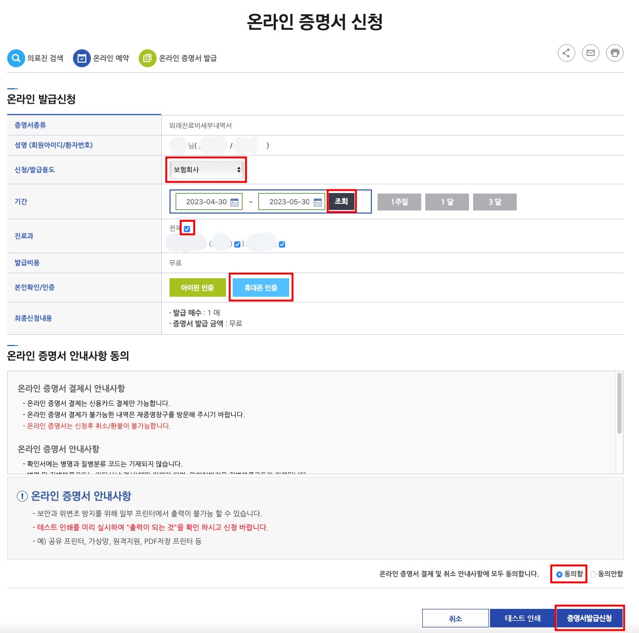 - '온라인 증명서 결제 및 취소 안내사항에 모두 동의합니다'에서 '동의함' 누르기