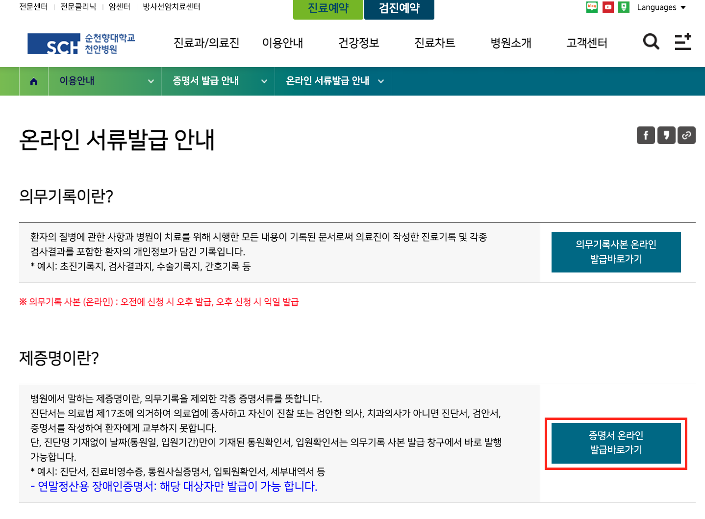 순천향대학교 천안병원 온라인 증명서 신청 방법