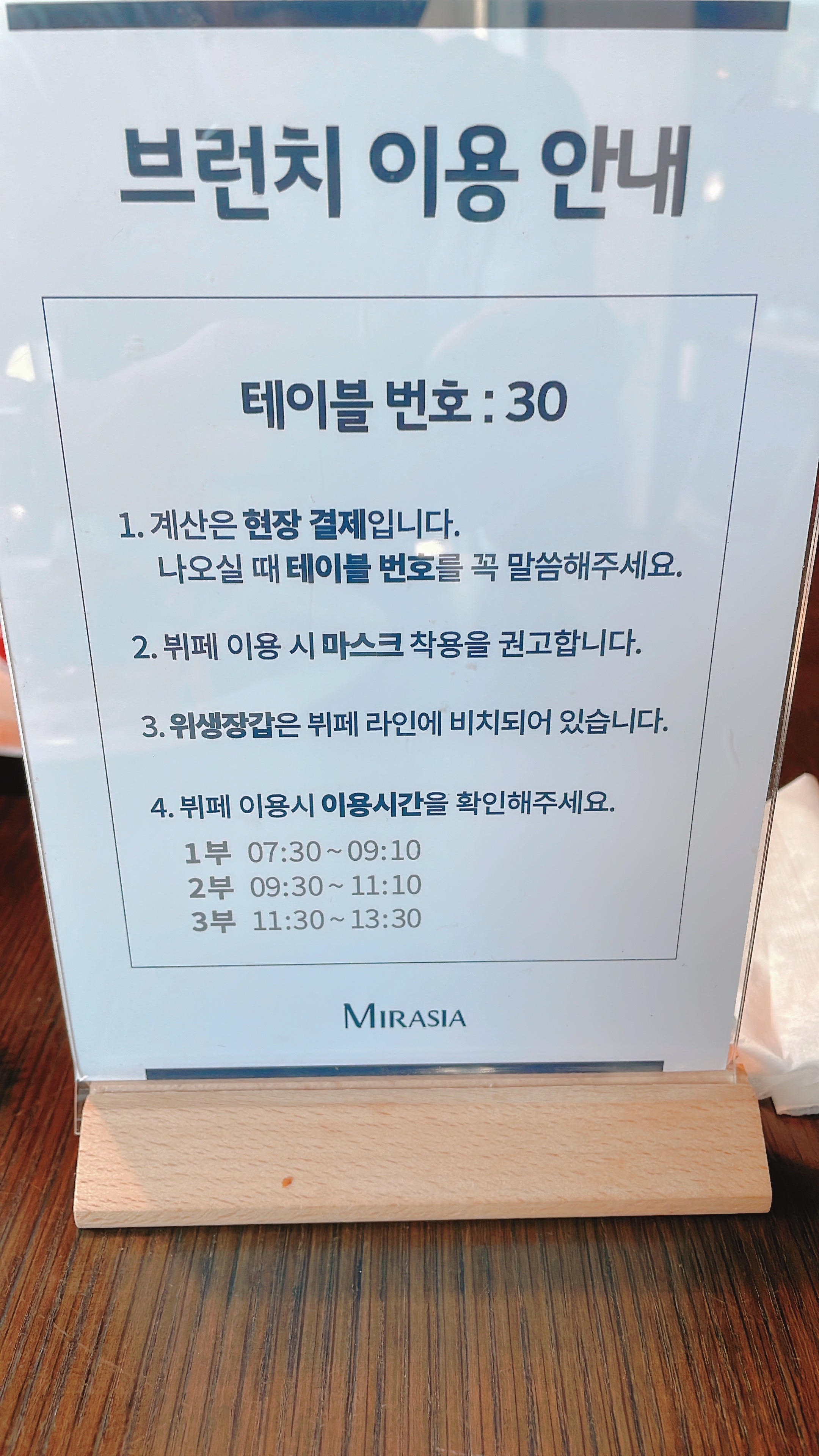 미라시아에 들어와 직원분의 안내를 받아 자리를 잡으면 테이블 위에 뷔페 가이드맵이 있습니다.