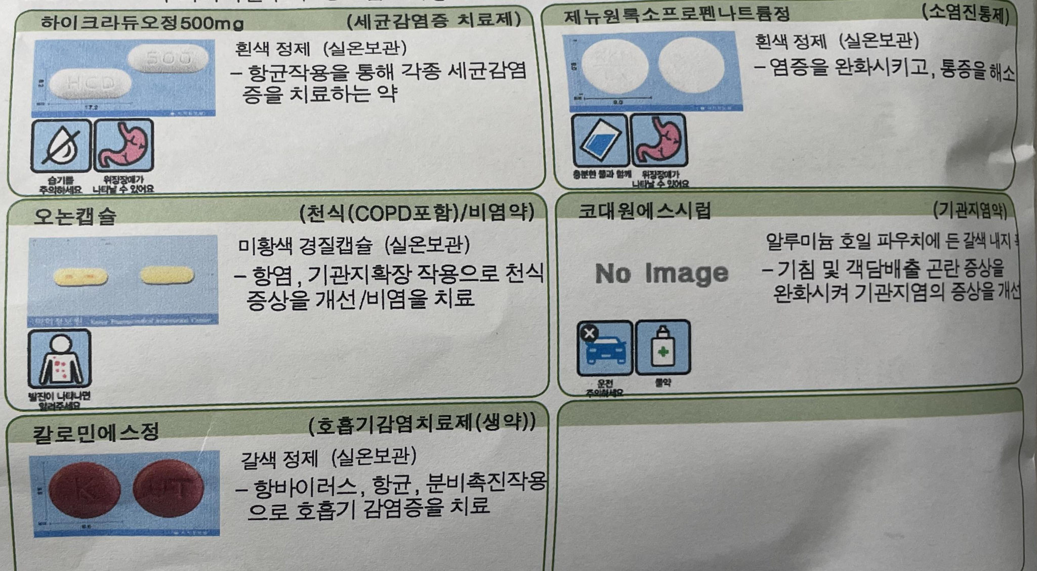 첫날은 항생제와 열과 통증을 가라앉히기 위해 소염진통제, 감기증상을 위한 약들을 처방받았습니다.
