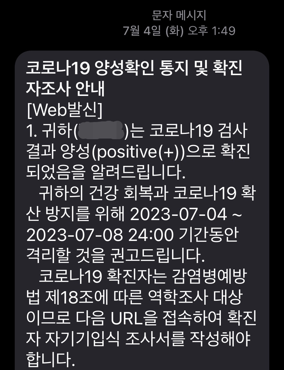 지난 주 2023년 7월 4일에 코로나 확진 판정을 받고,