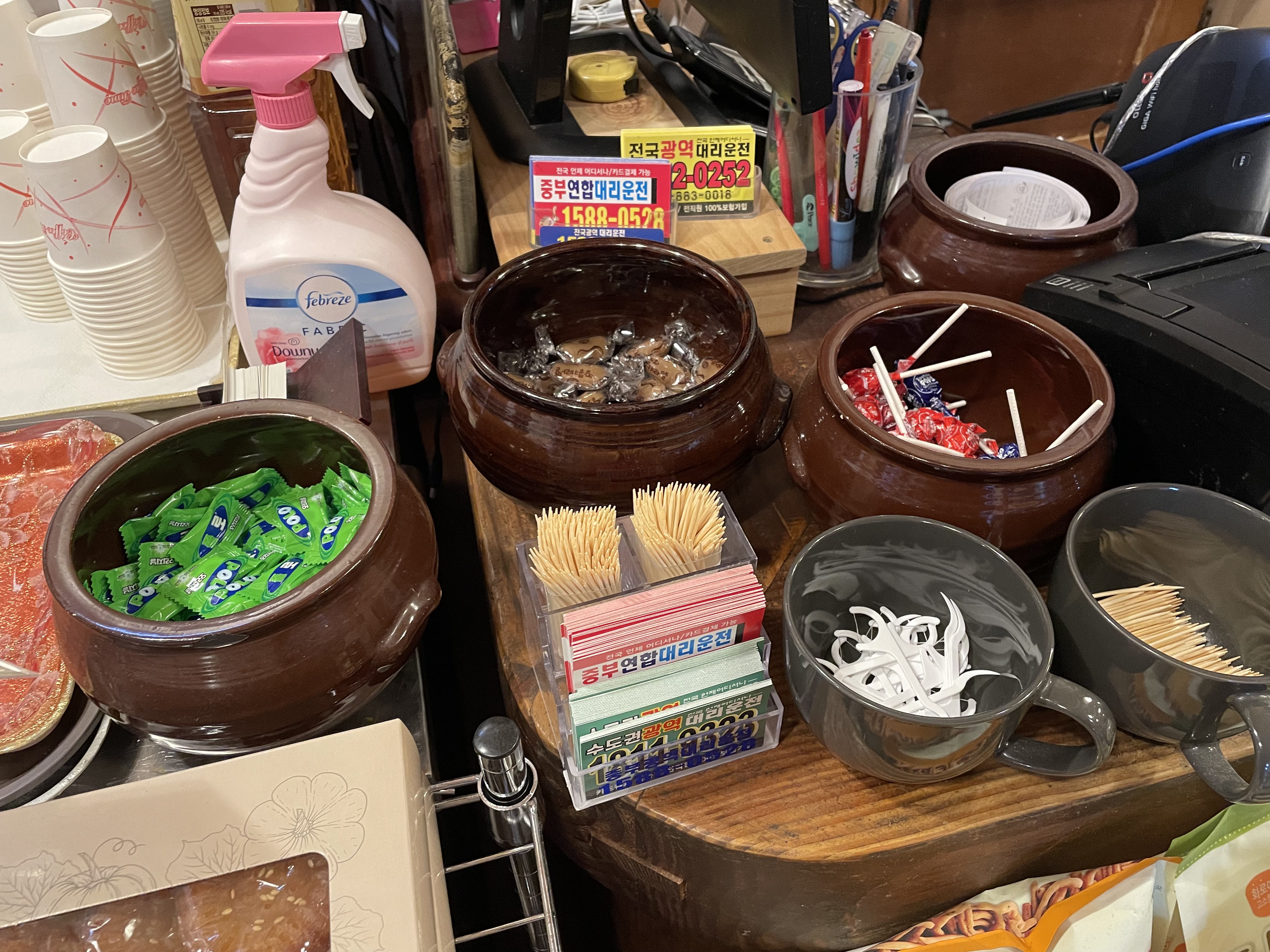 요즘에는 식당 카운터에 사탕을 주는 곳을 찾기 힘든데, 이곳은 가격대가 있어서인지 3종류나 준비되어 있습니다.