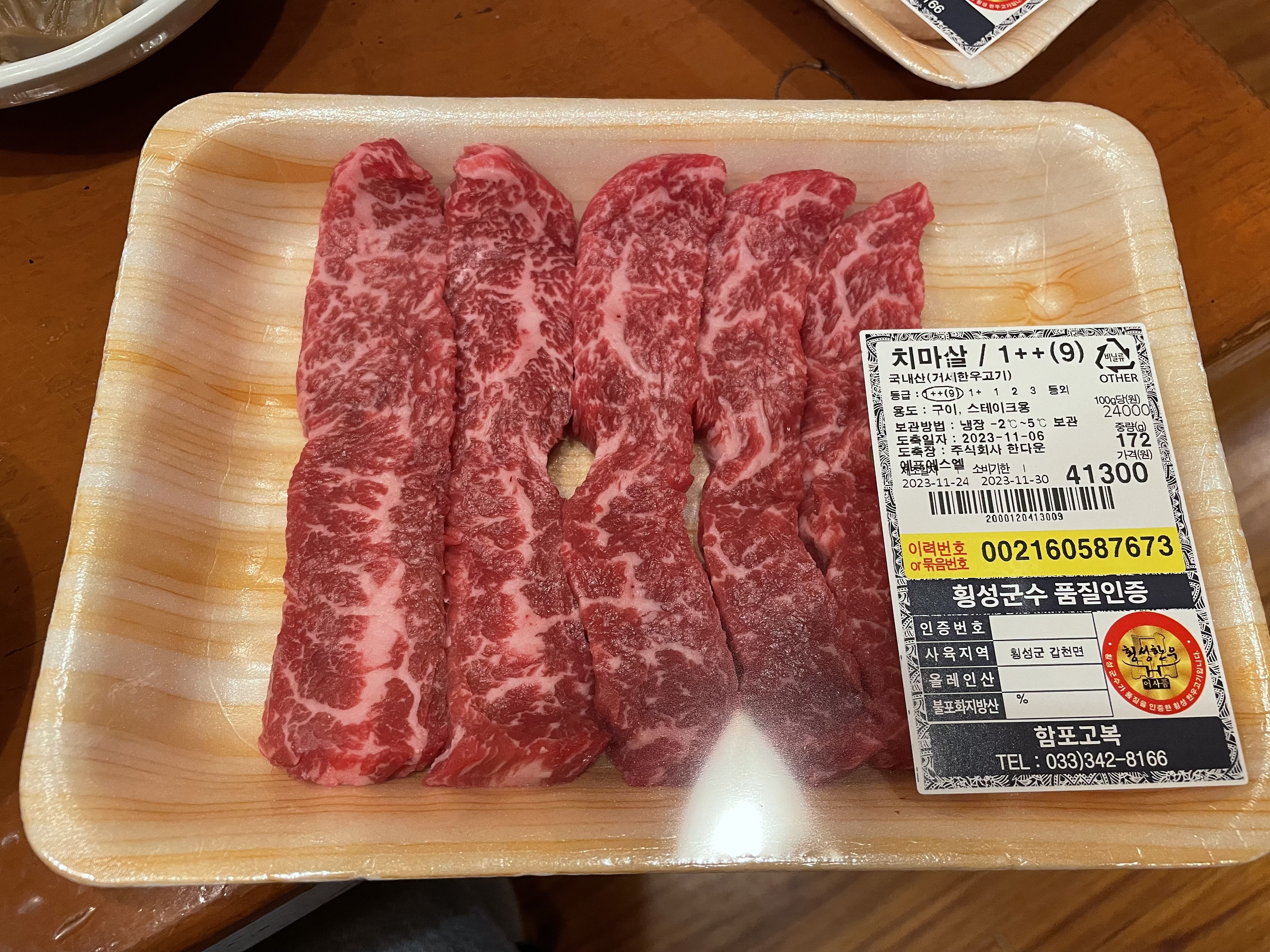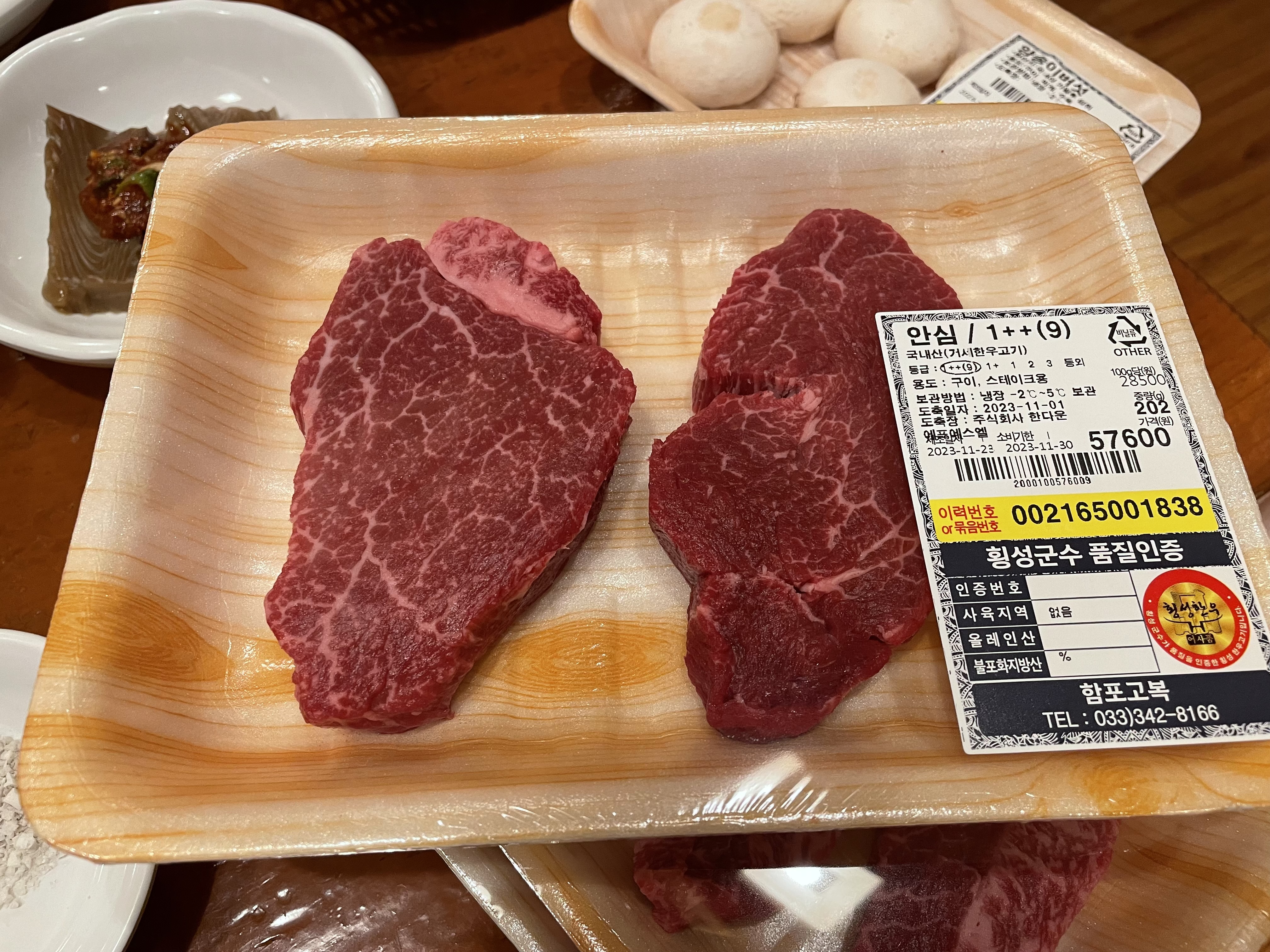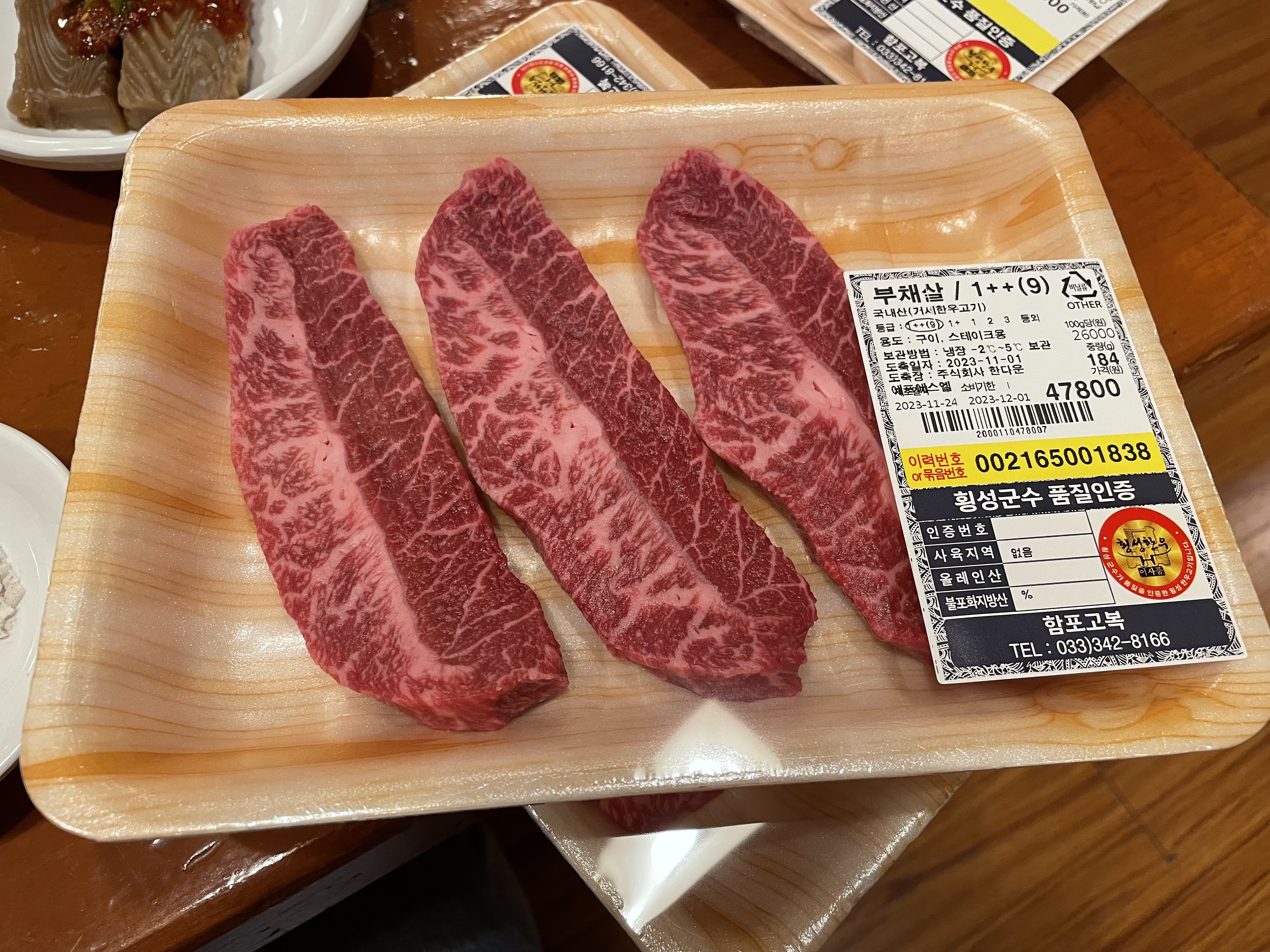 함포고복에서 판매하는 한우는 모두 횡성한우 투뿔 (1++)이었습니다.