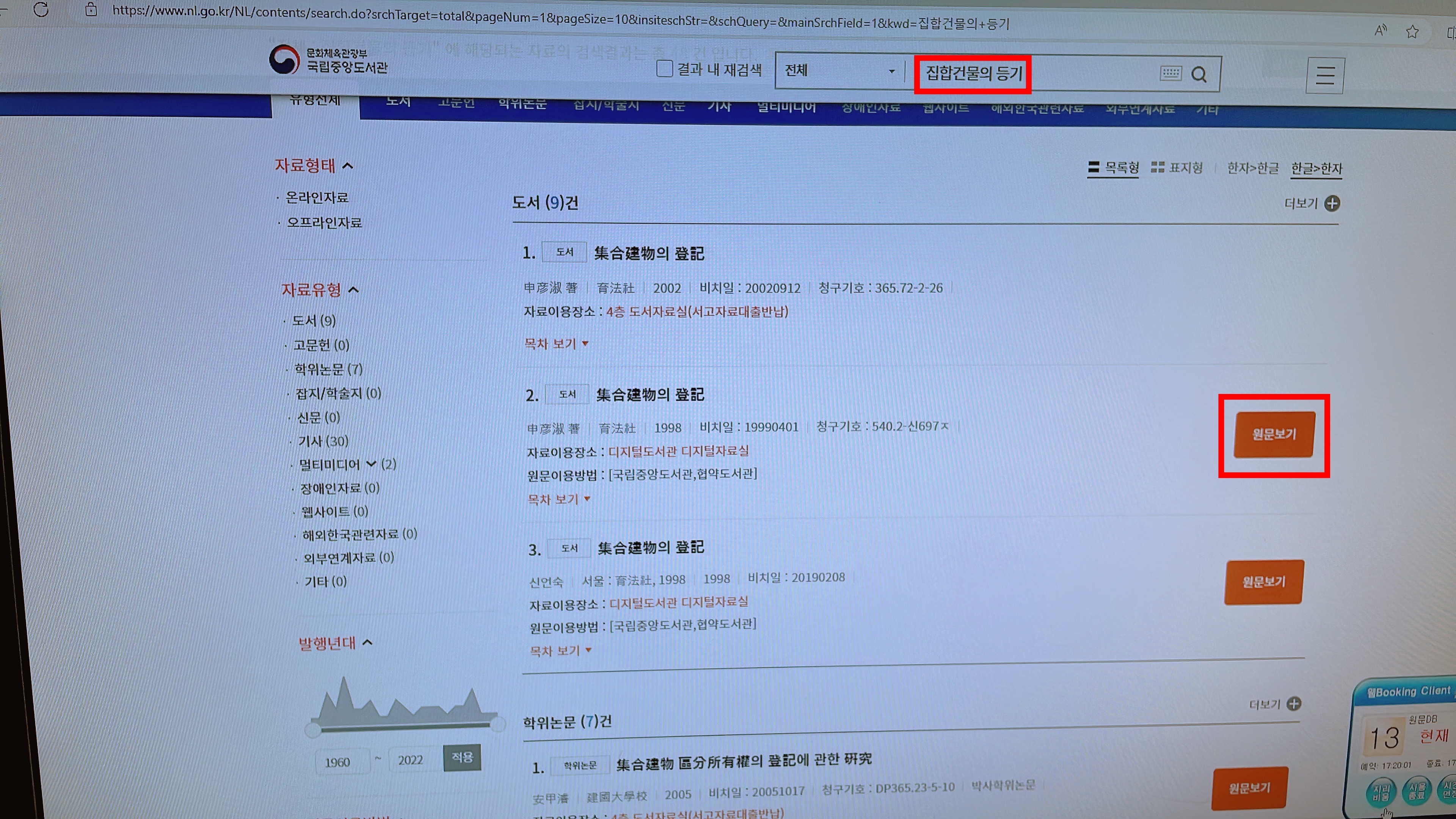 원문보기를 하고자 하는 도서 이름을 검색한 뒤, '원문보기' 버튼을 눌러줍니다. 저는 세이노가 추천했던 '집합건물의 등기'를 검색해봤습니다.