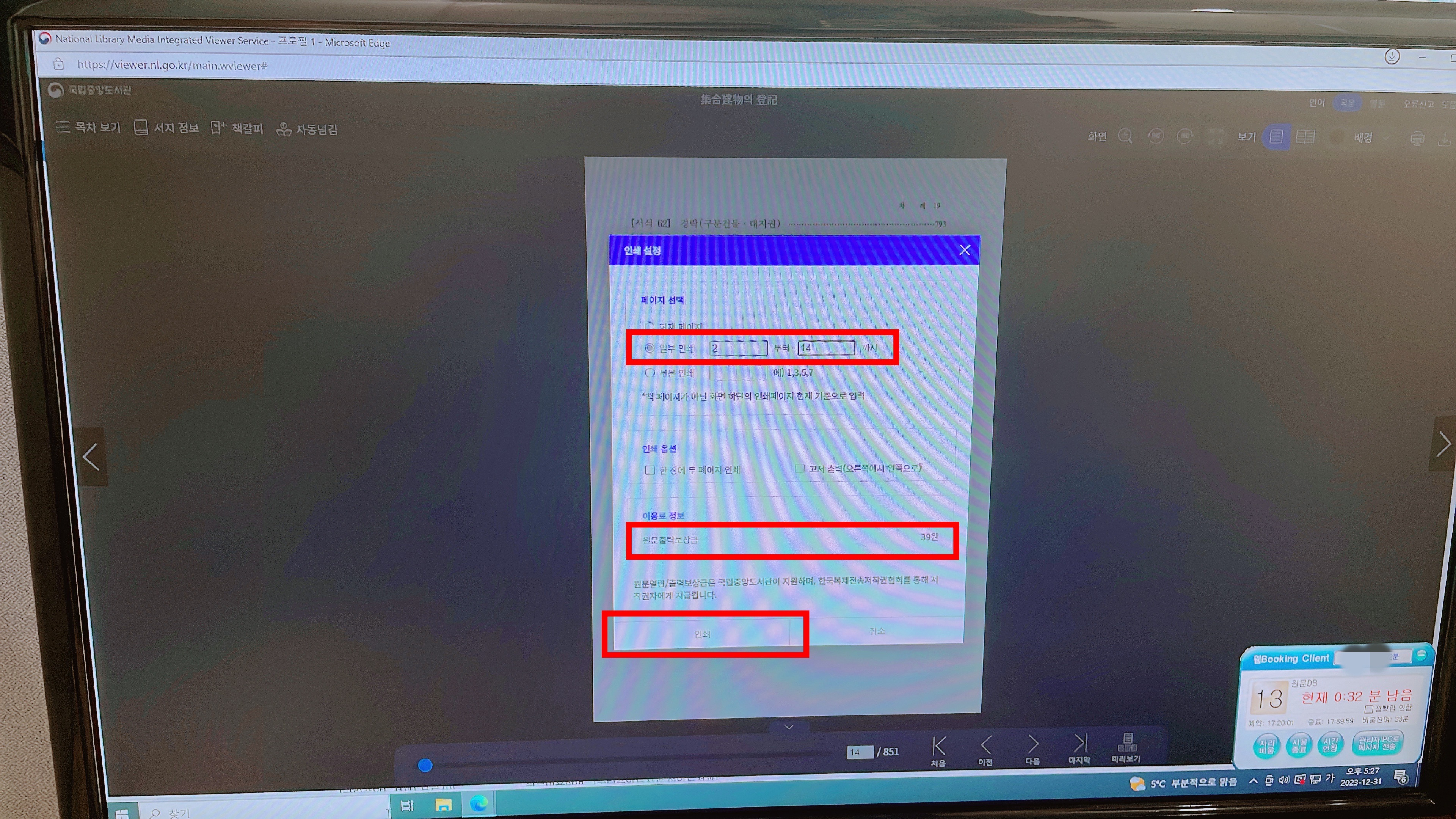 원하는 페이지 범위를 선택하고, '인쇄' 버튼을 눌러주시기 바랍니다. 법규 상 1/3 이상 복사를 해서는 안된다는 팝업이 나옵니다.