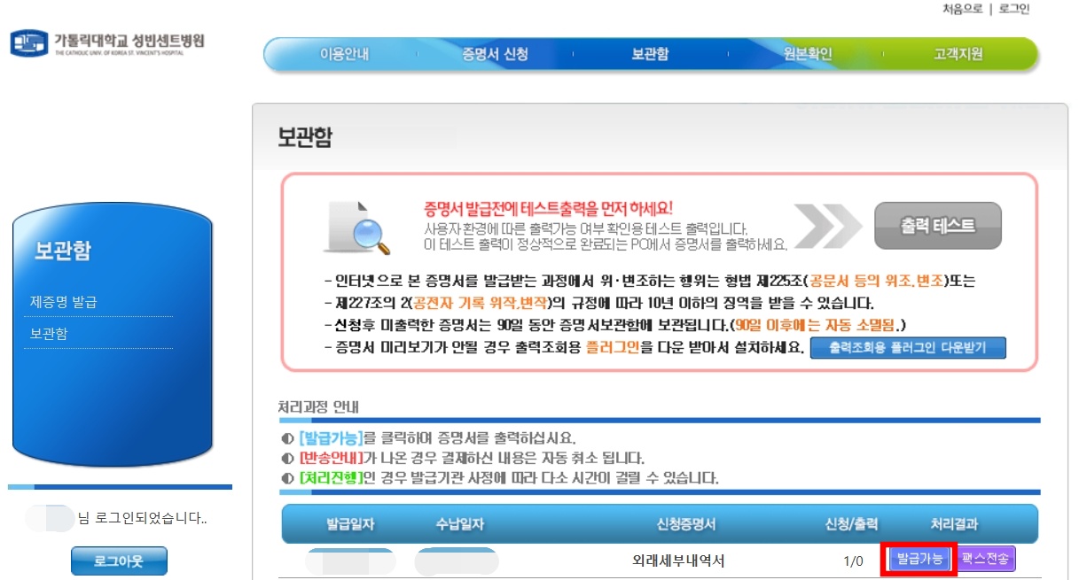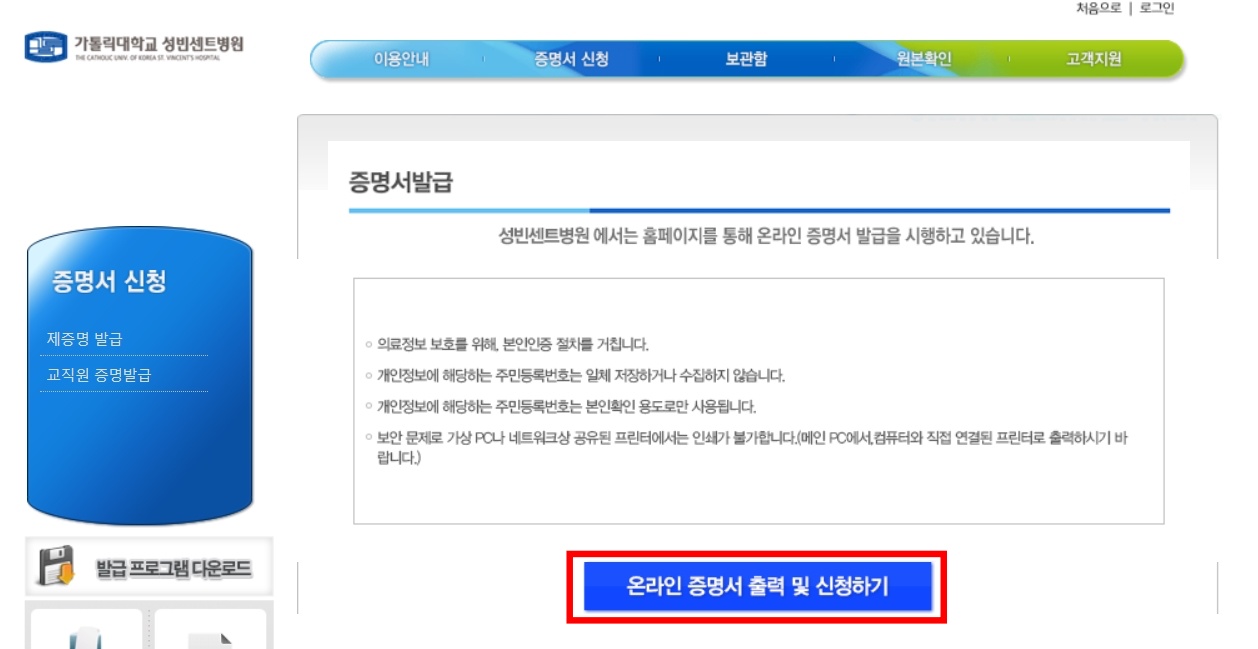 성빈센트병원 진료비 세부내역서(외래세부내역서) 인터넷 발급 방법