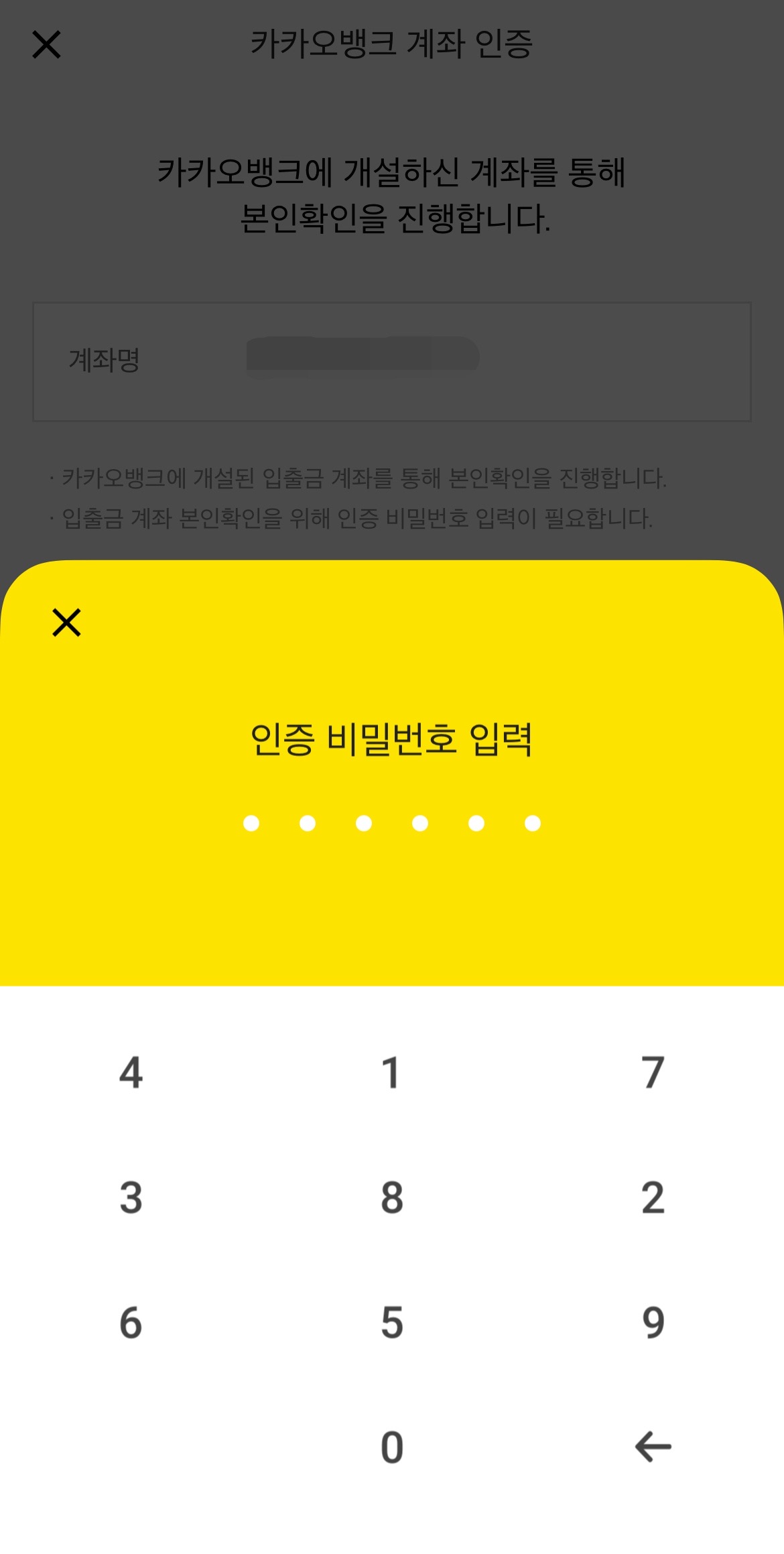 선택한 계좌의 인증 비밀번호를 입력해줍니다.