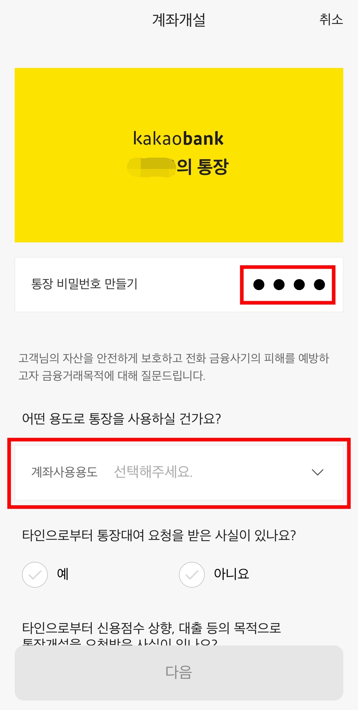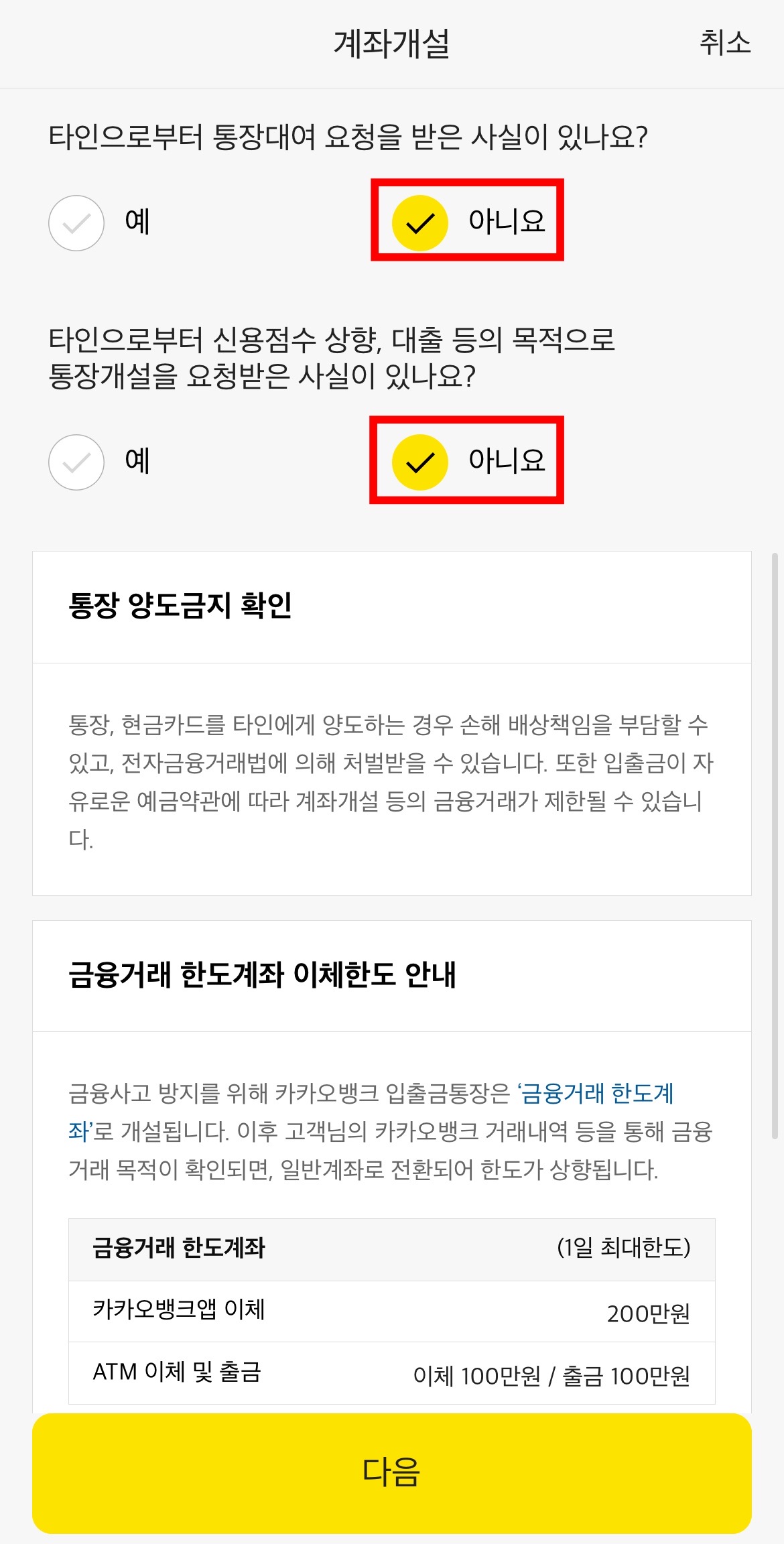 이제 중요한 질문에 대해 답을 할 차례입니다. 딱 봐도 보이스피싱 등의 범죄에 연루되어 통장을 개설하는지 확인하기 위한 절차인 것 같습니다. 여러분들이 본인 의지로 입출금통장을 만드시는 거라면 2개의 질문에 '아니오'를 선택합니다.