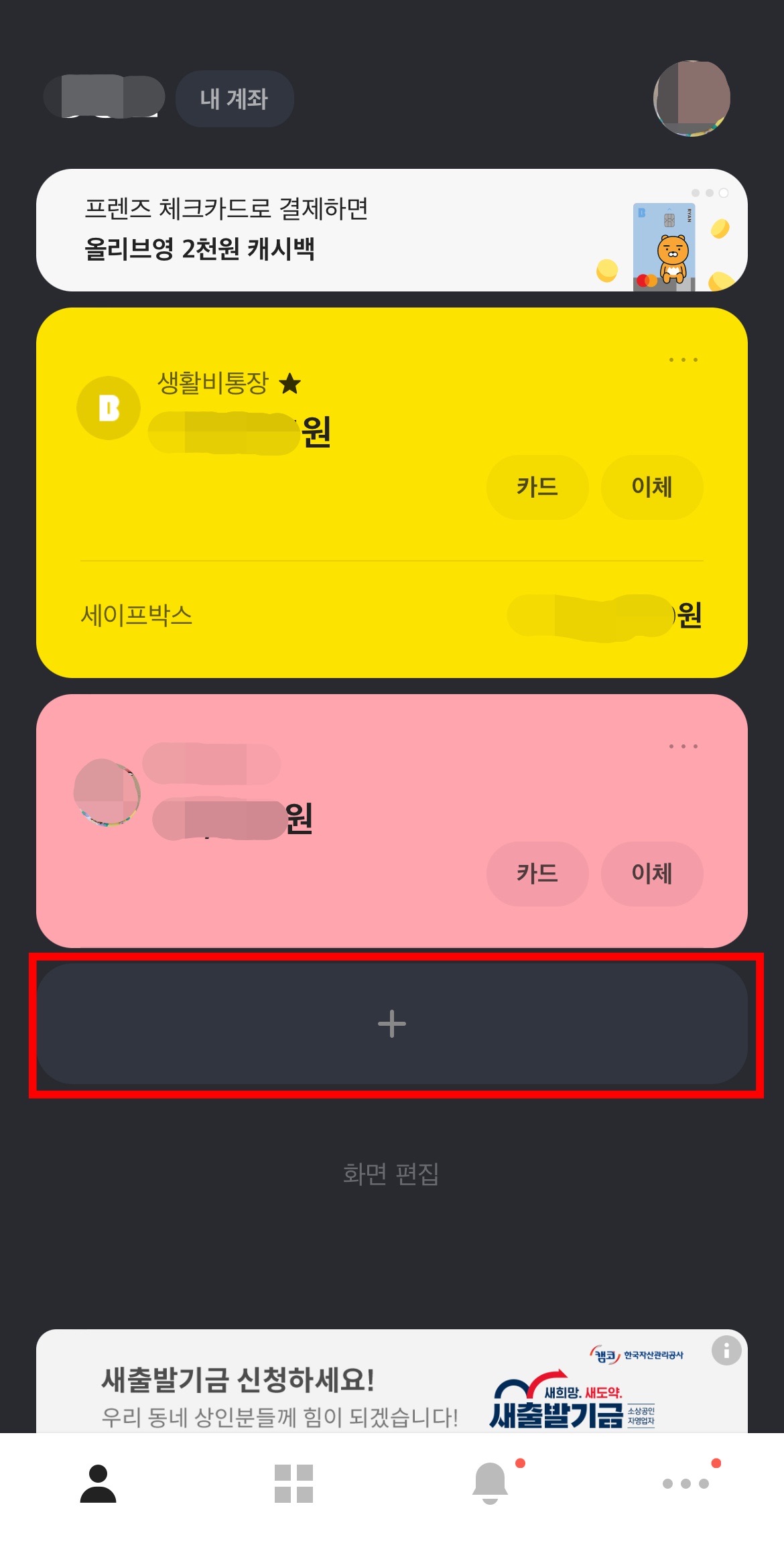 준비가 다 되셨으면 카카오뱅크 앱을 실행하시고 '+' 를 눌러봅니다.