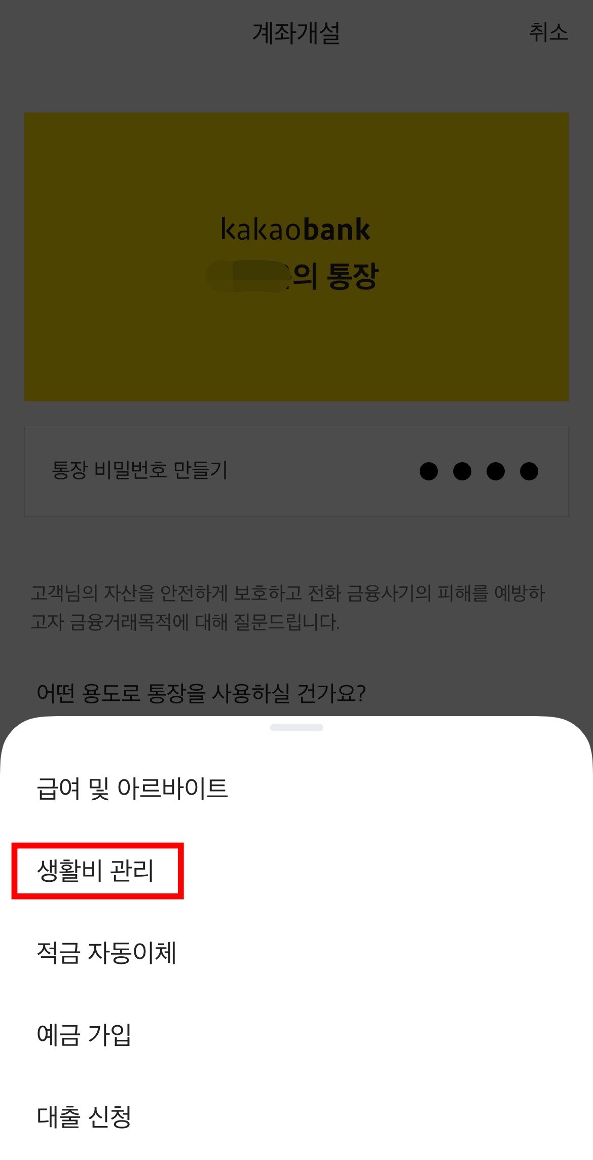 계좌사용용도가 어떻게 되는지 물어보는데 저는 '생활비 관리'를 선택했습니다. 여러분은 각자 상황에 맞는 항목을 선택하시면 되겠습니다.