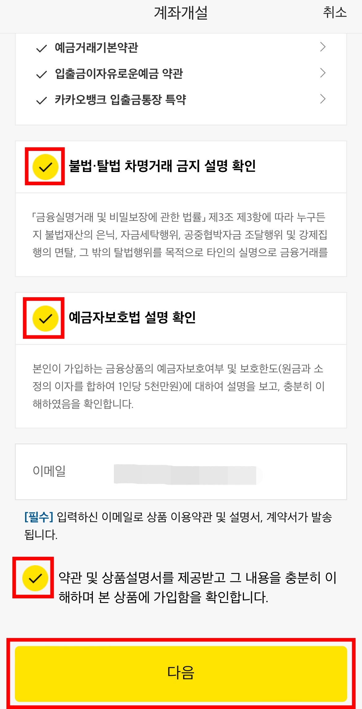 '카카오뱅크 입출금통장 상품설명서', '상품 이용약관', '불법.탈법 차명거래 금지 설명 확인', '예금자보호법 설명 확인'을 체크해줍니다.