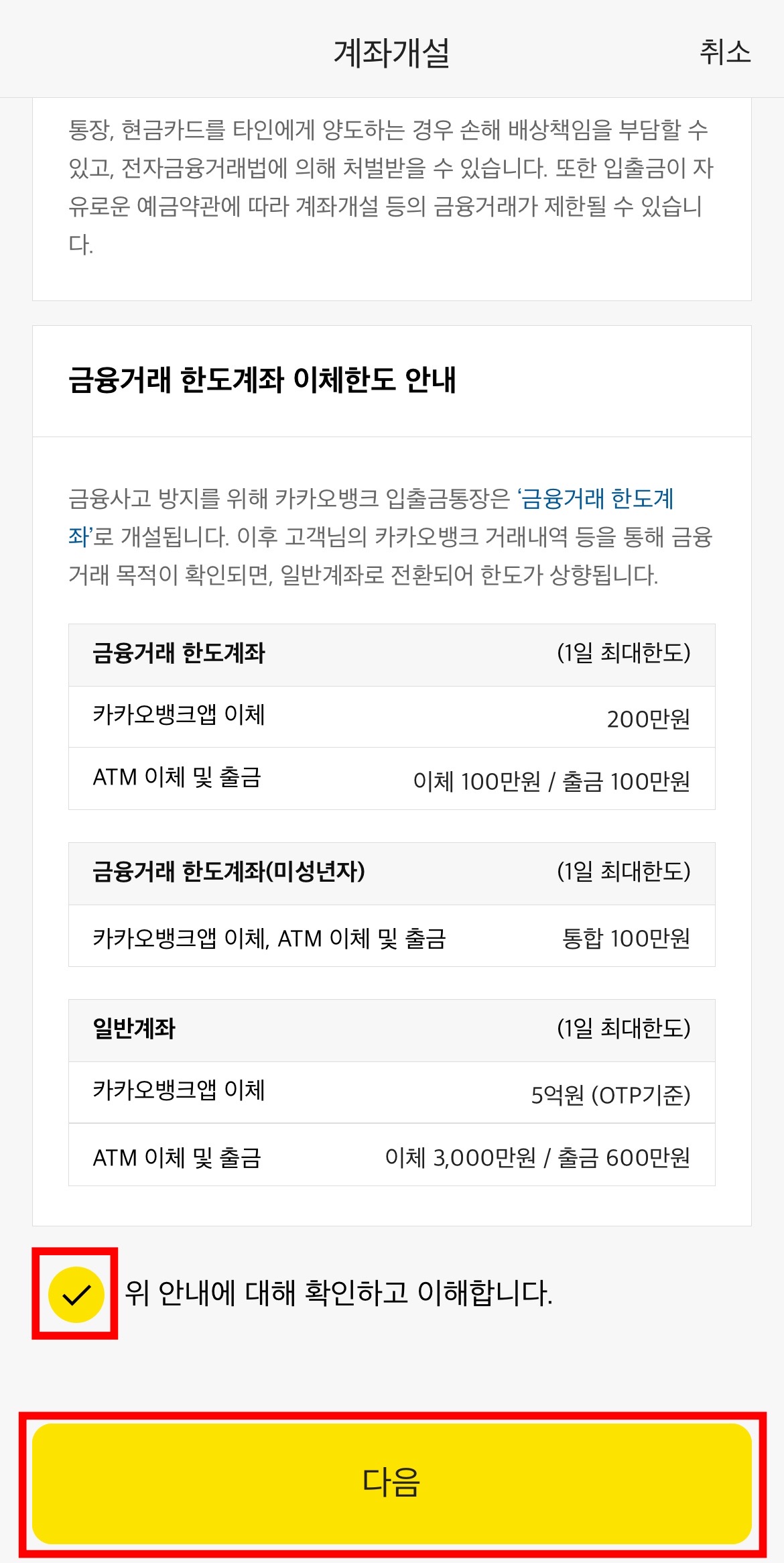 아래로 좀더 내려보면 '금융거래 한도계좌 이체한도 안내'가 나옵니다. 이 내용도 사실 보이스피싱같은 범죄와 관련된 내용입니다. 혹시라도 범죄와 관련된 목적으로 계좌가 개설되었을 수 있기에 금융기관에서 만든 안전장치가 아닌가 합니다. 지금 만들고 있는 입출금계좌는 이체 한도가 1일 최대 200만원으로 제한된 '금융거래 한도계좌'로 개설이 됩니다. 만약 보다 큰 금액을 이체하기 위해서는 별도의 신청을 통해 '일반계좌'로 변경을 해야 합니다. '일반계좌'로의 변경을 위한 절차는 다른 포스팅을 통해 안내드리도록 하고, 우선은 '위 안내에 대해 확인하고 이해합니다'를 체크하시고 '다음'을 눌러봅니다.