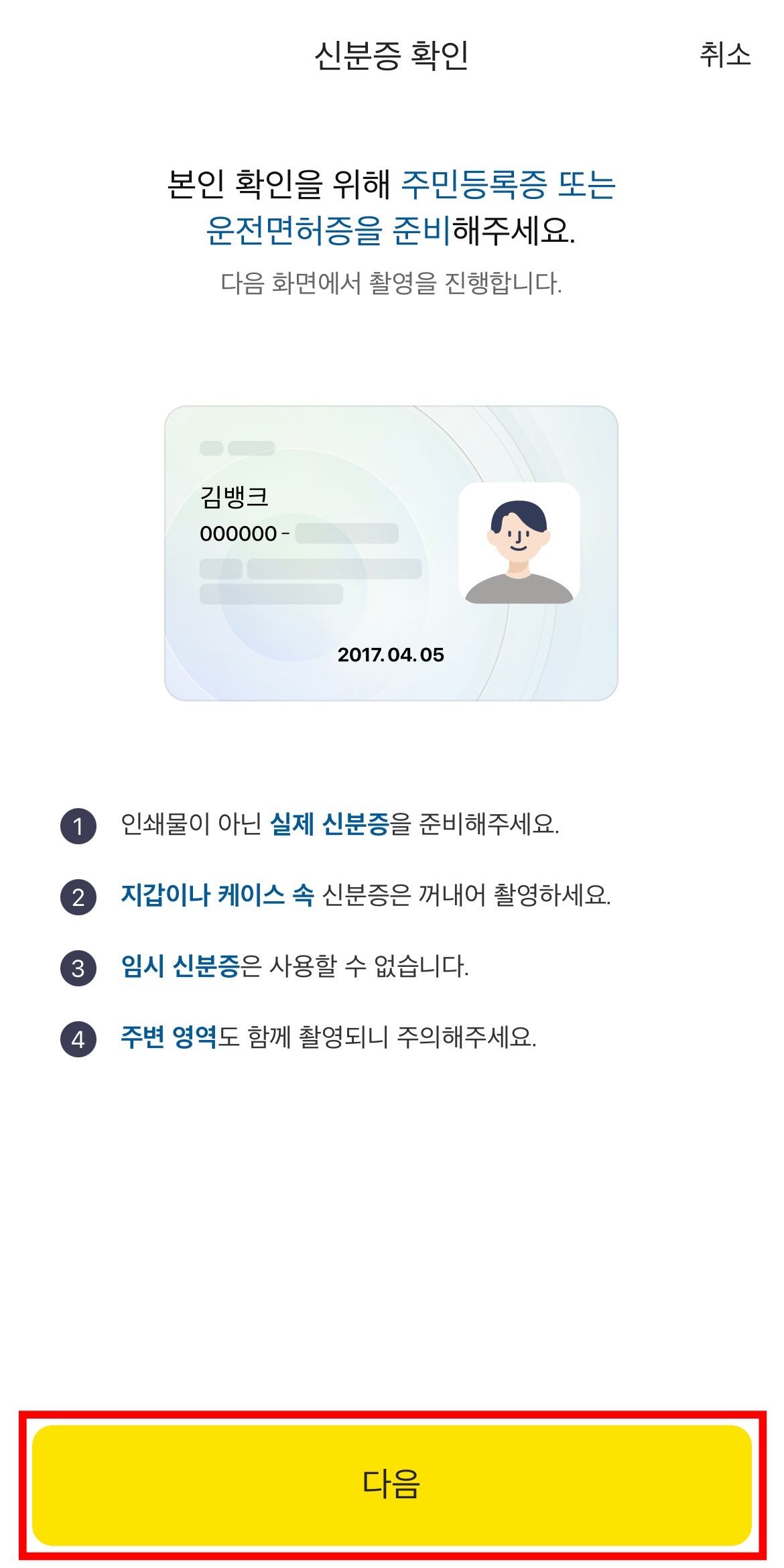 이제 본인 인증을 할 차례입니다. 가지고 계신 '주민등록증' 이나 '운전면허증'을 준비하시고 '다음'을 눌러줍니다. 저는 '운전면허증'으로 진행해봤습니다.