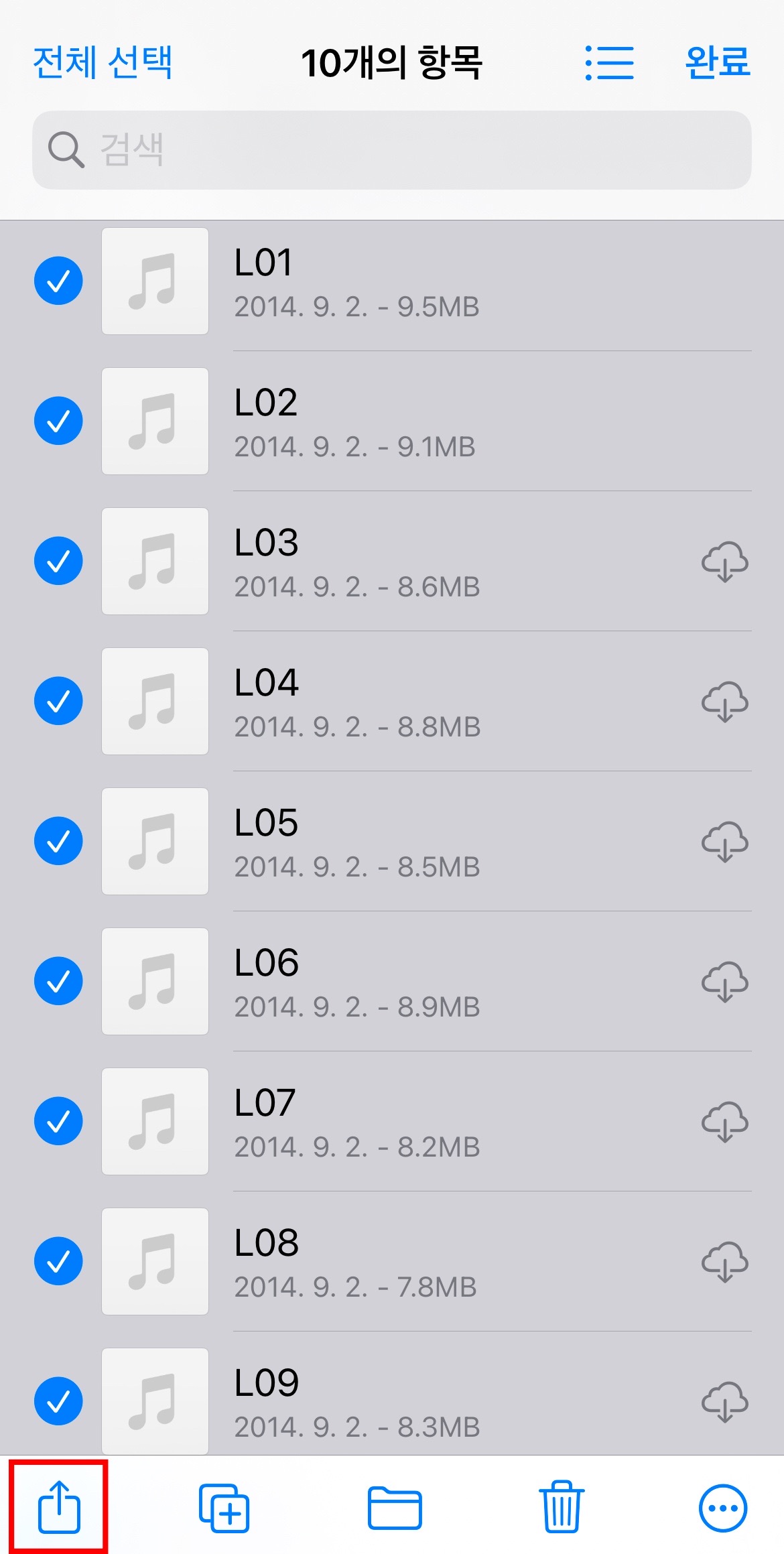 2. 연속으로 재생하고 싶은 MP3 파일들을 선택 후 공유 버튼 누르기