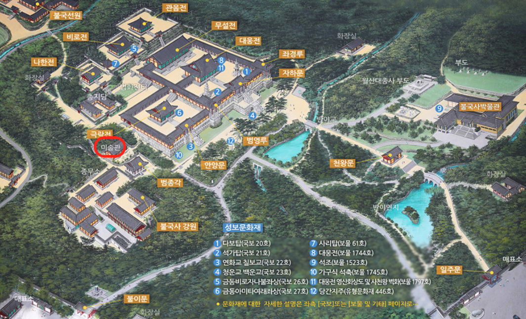 불국사에서도 기념품을 구입할 수 있는 곳이 있으니, 아래 사진에 빨간색 네모로 표시한 '미술관'이 그 주인공입니다. 불국사의 여러 전각들과 다보탑, 석가탑을 관람하는 것도 빼놓을 수 없지만 미술관에서 기념품을 구경하는 것도 여행의 재미입니다.