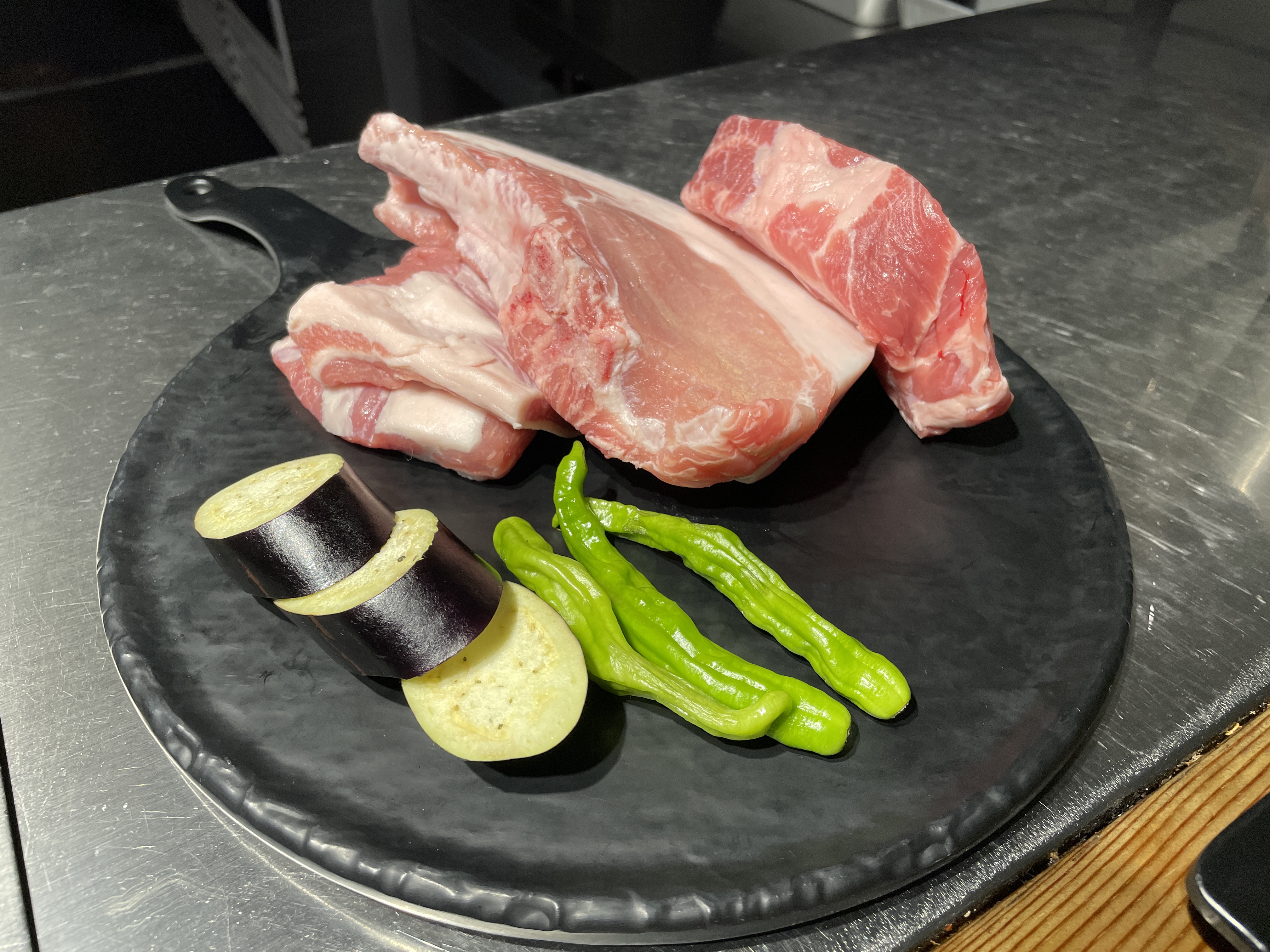 드디어 오늘의 주인공인 고기가 도착했습니다. 사진에서 보이는 것처럼 고기, 가지, 꽈리고추를 함께 구워주십니다.