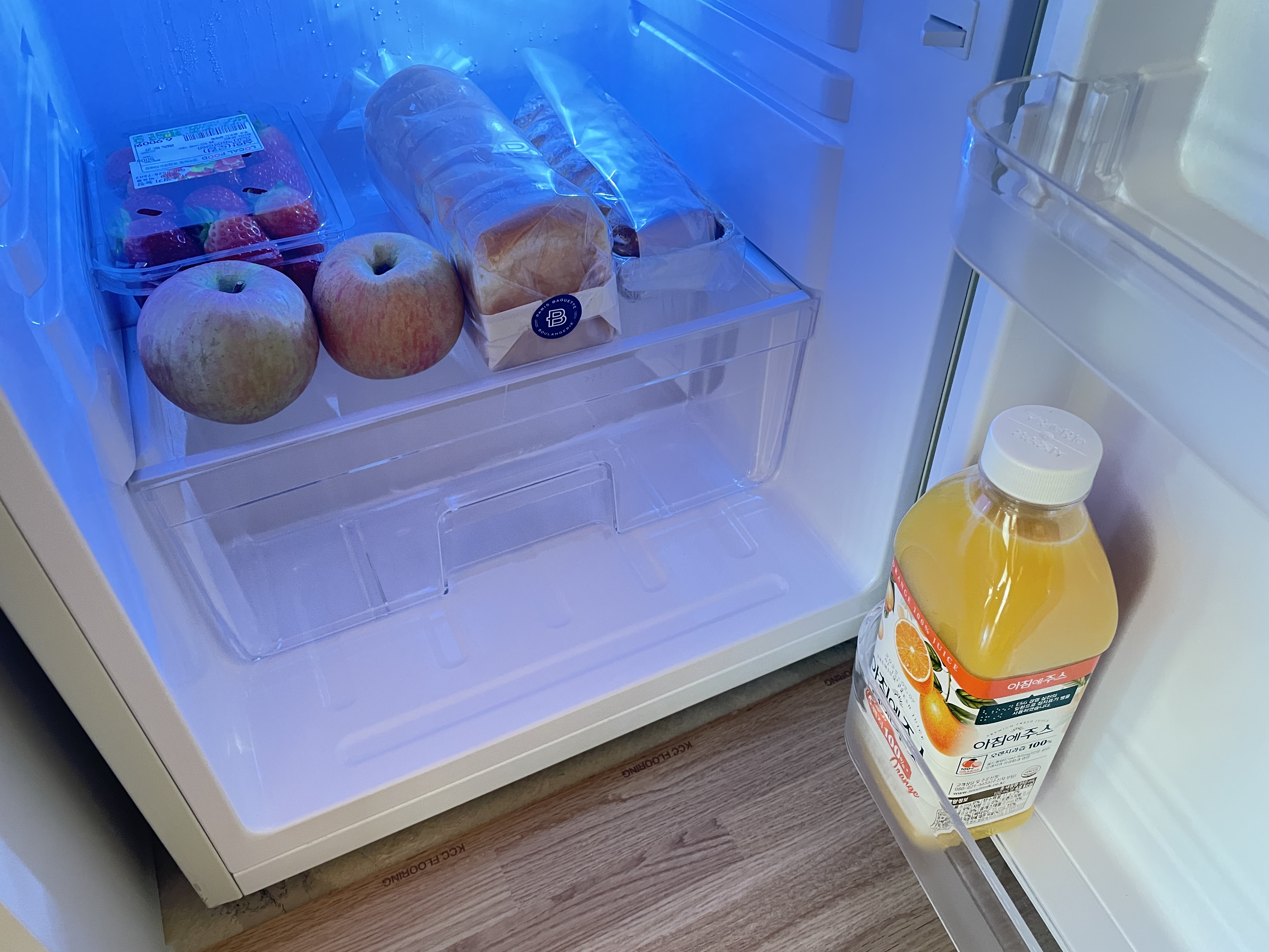 조식을 매일 사장님이 주시는건 아닙니다. 대신 입실을 할 때 냉장고에 이틀 동안 먹을 수 있는 음식들이 들어있습니다. 제가 방문했을 때는 빵 2개, 사과 2개, 딸기 1팩, 오렌지주스 1병이 들어 있었습니다.