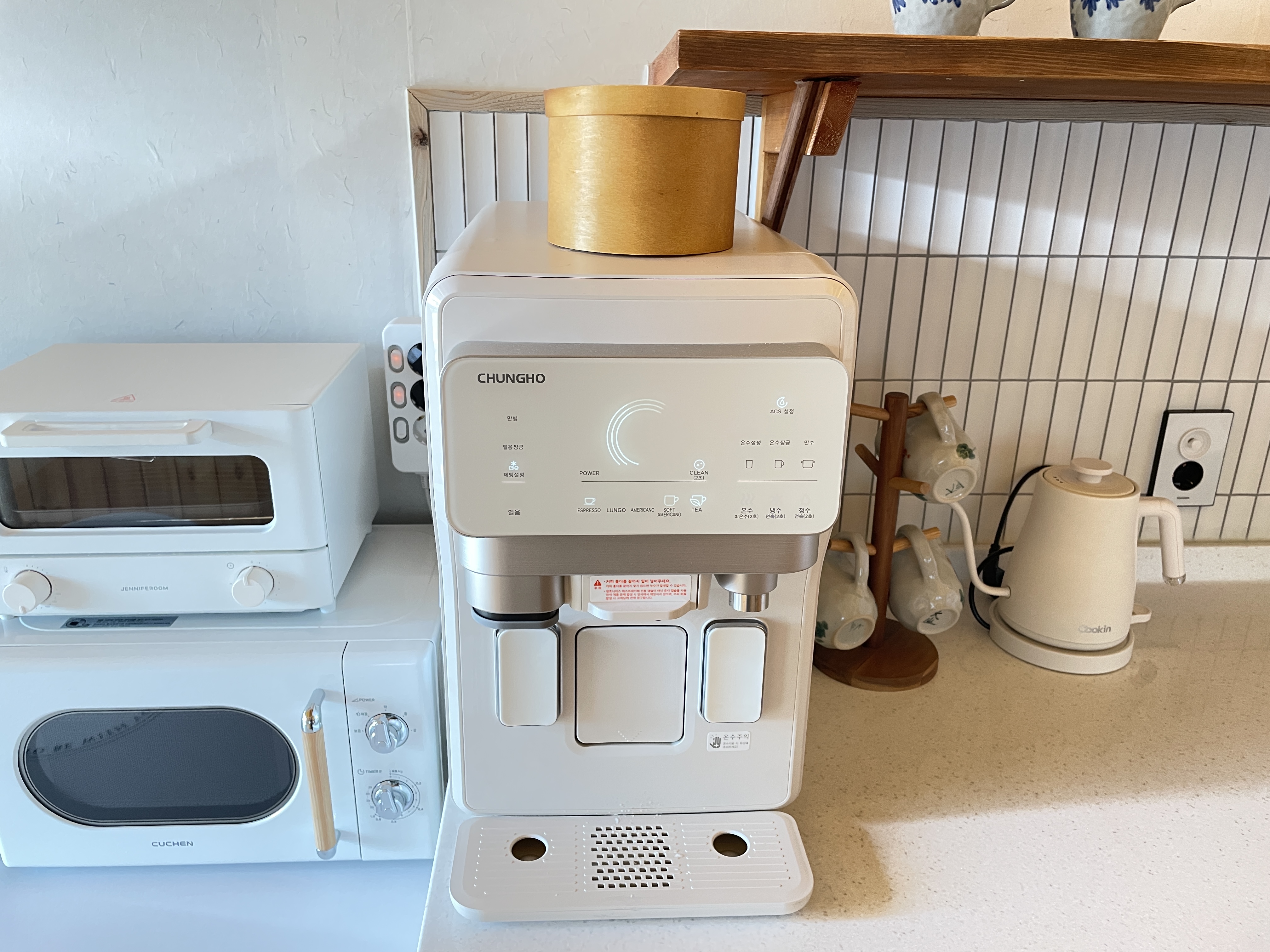 싱크대쪽에는 캡슐커피까지 내릴 수 있는 최신 정수기, 토스트기, 전자레인지, 커피포트가 있습니다. 위에 있는 동그란 통에는 커피, 차, 과자가 들어있습니다.