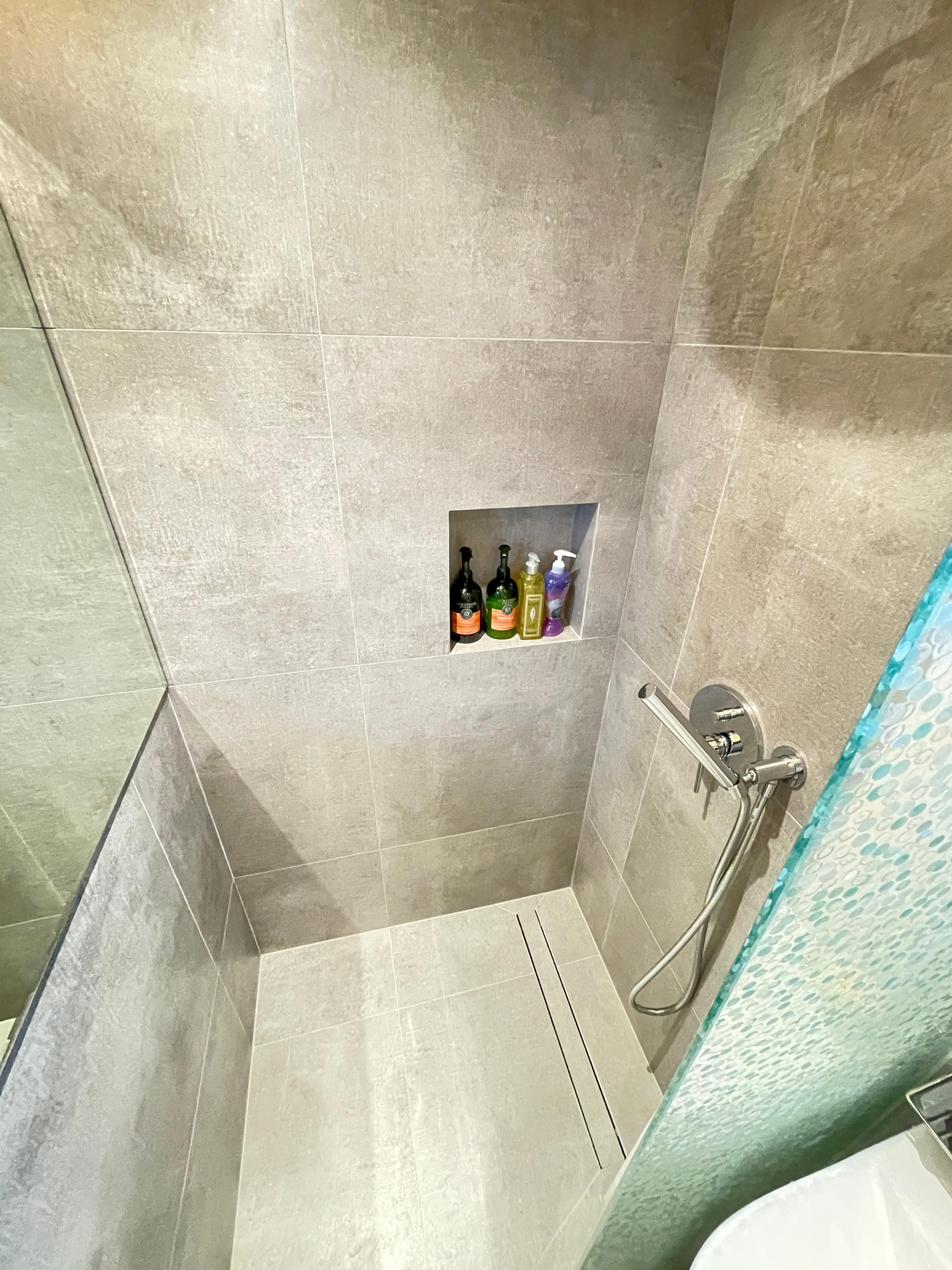 화장실에 들어가보니 역시나 깔끔하고 깨끗합니다. 요즘에는 어매니티가 없는 숙소들이 많은데, 이곳에는 샴푸와 린스는 록시땅 제품이고, 바디워시와 펌핑 치약도 준비되어 있습니다.
