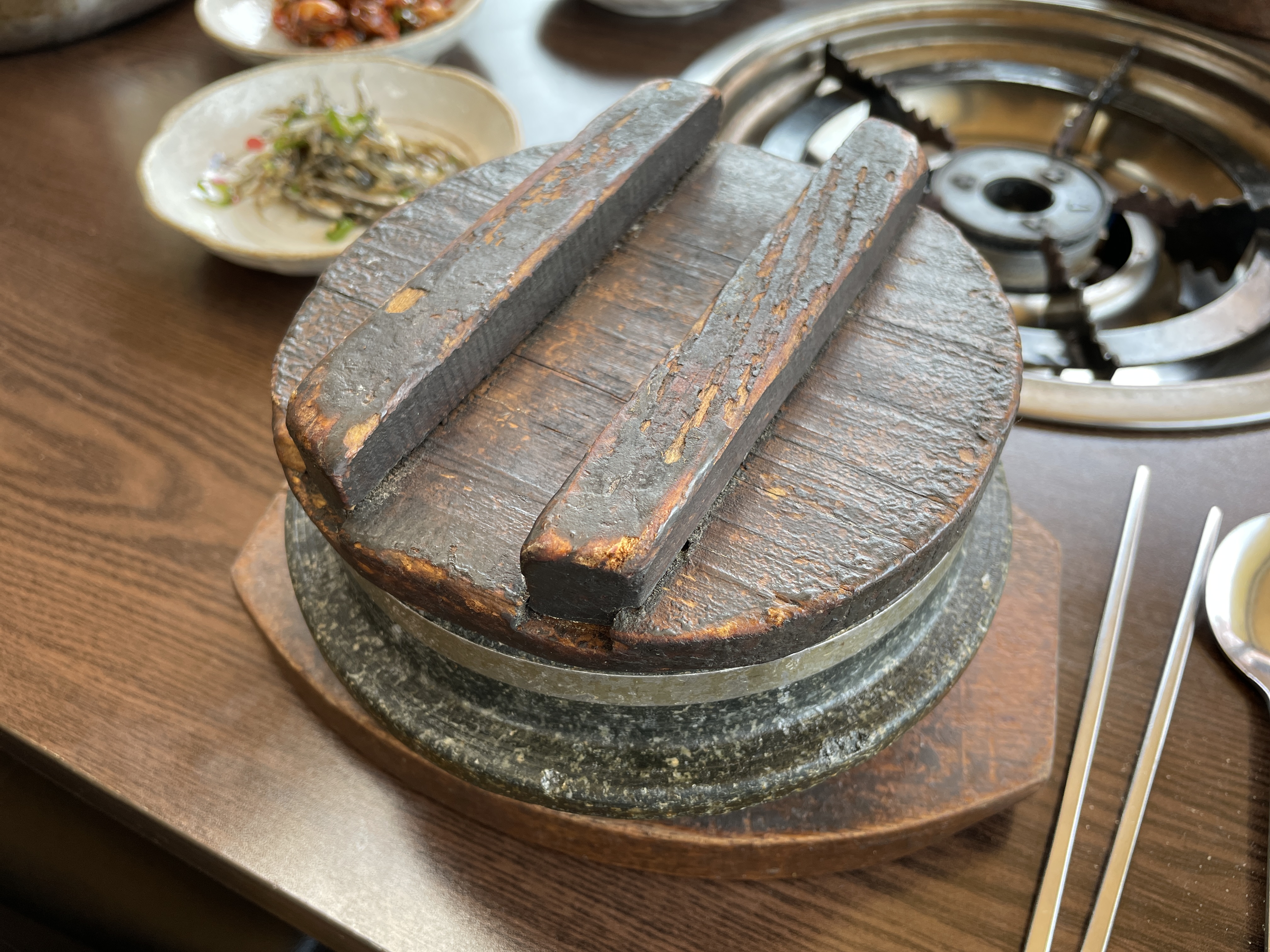 맛집의 전통과 세월이 느껴지는 돌솥밥의 뚜껑을 열어봅니다.