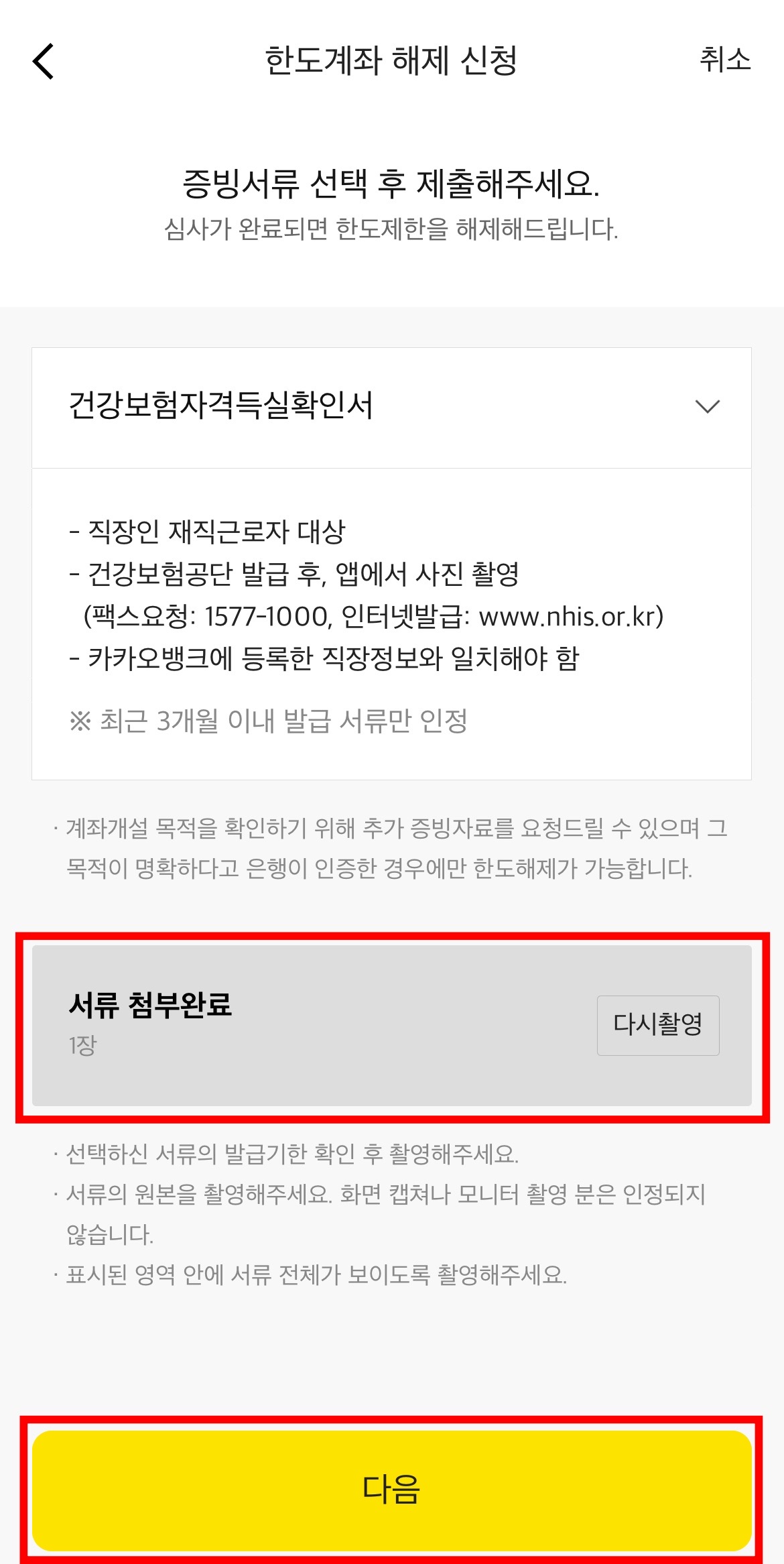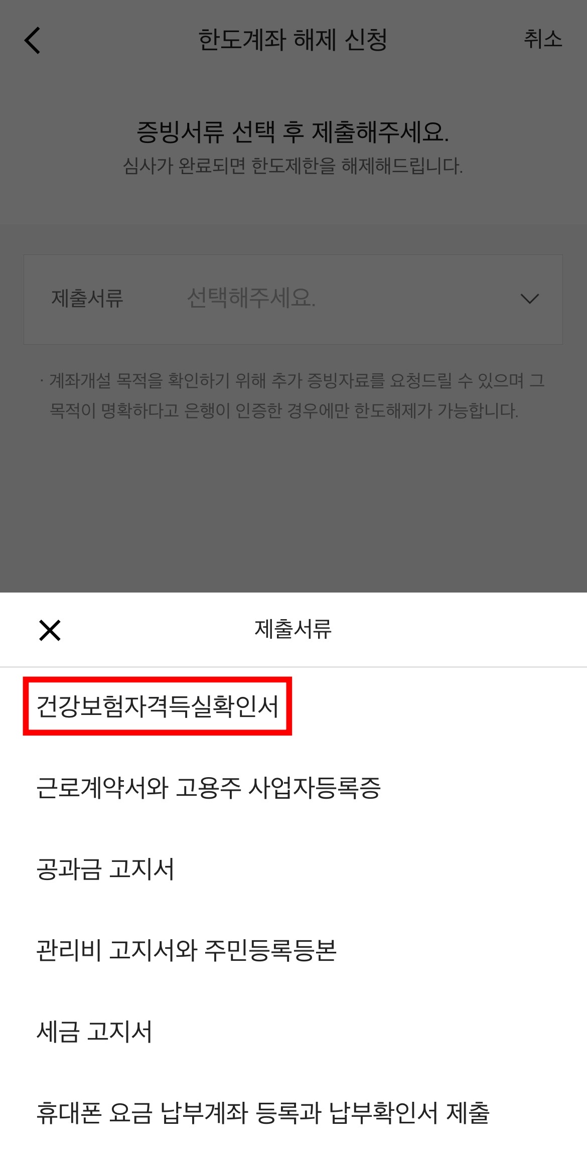 시작에 앞서 한도계좌 해제 신청을 위해서는 '건강보험자격득실확인서', '근로계약서와 고용주 사업자등록증', '공과금 고지서', '관리비 고지서와 주민등록등본', '세금고지서', '휴대폰 요금 납부계좌 등록과 납부확인서 제출' 중 한가지를 선택해서 진행해야 합니다. 저는 그중에 '건강보험자격득실확인서'를 이용했습니다. '건강보험자격득실확인서' 발급방법은 이전 포스팅에서 설명드렸으니 먼저 확인해보시고 오시는걸 추천드립니다.