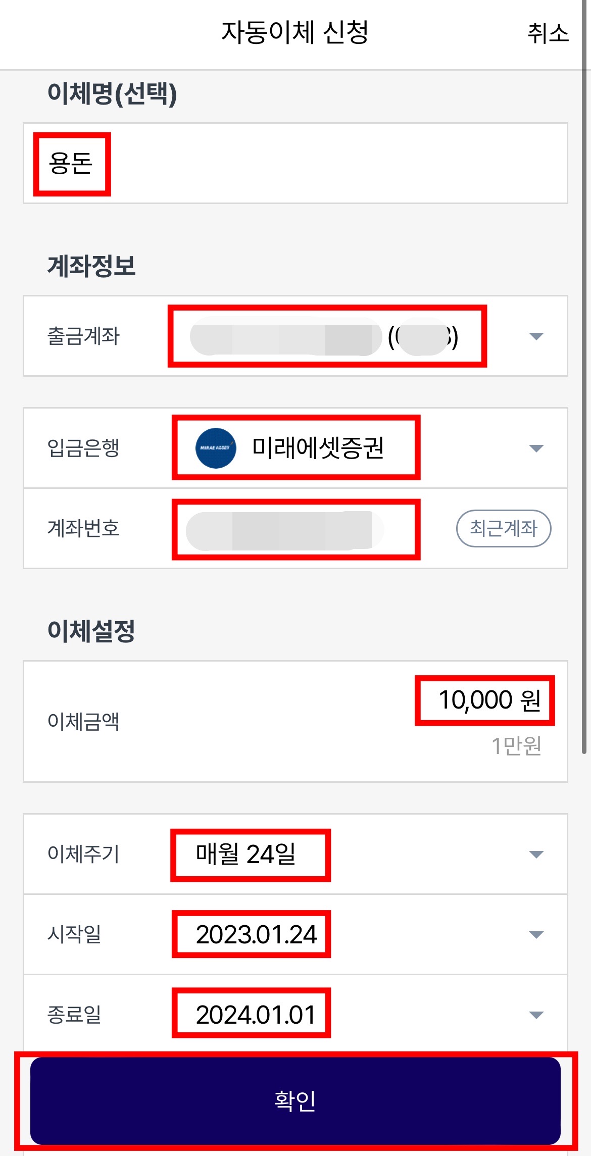 '시작일'에는 언제 처음으로 자동이체가 시작되게 할 것인지 선택해주시고,