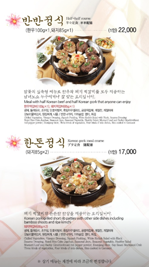 떡갈비는 한우특정식 / 한우정식 / 반반정식 / 한돈정식 입니다.