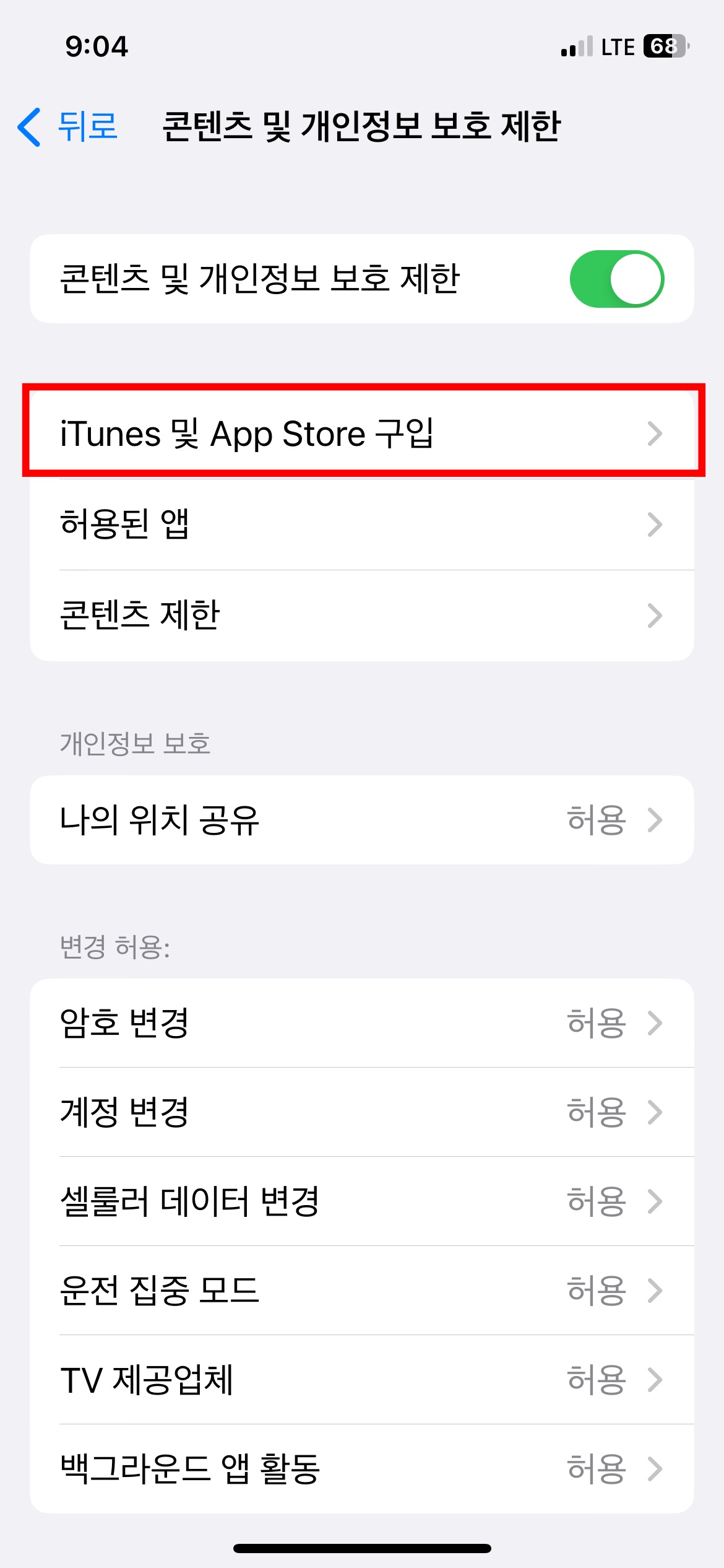 '콘텐츠 및 개인정보 보호 제한'을 눌러줍니다.